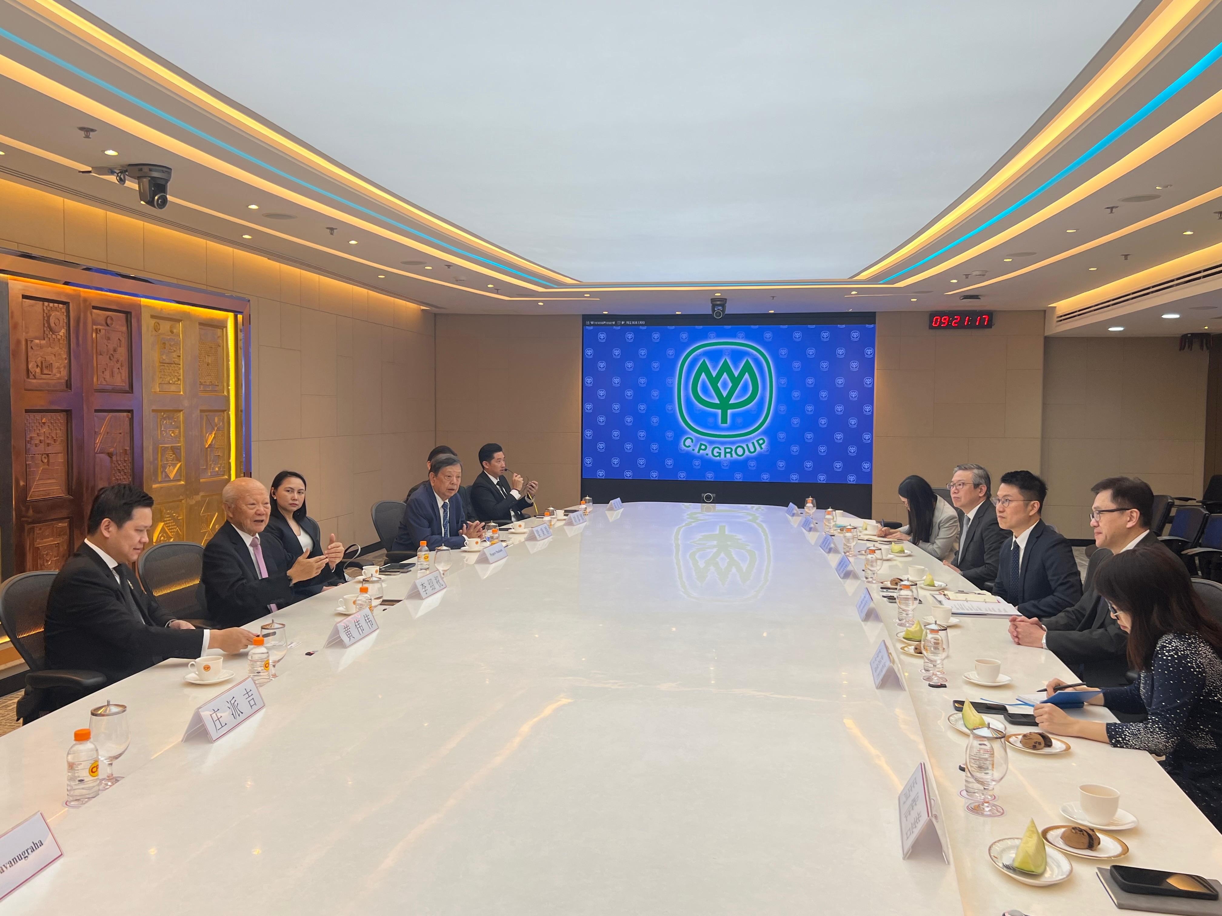 創新科技及工業局局長孫東教授(右二)今日(一月二十八日)在曼谷到訪以泰國為基地、業務組合高度多元化的綜合企業——正大集團,與集團管理層進行會談。香港科技園公司行政總裁黃秉修(右四)亦有出席。