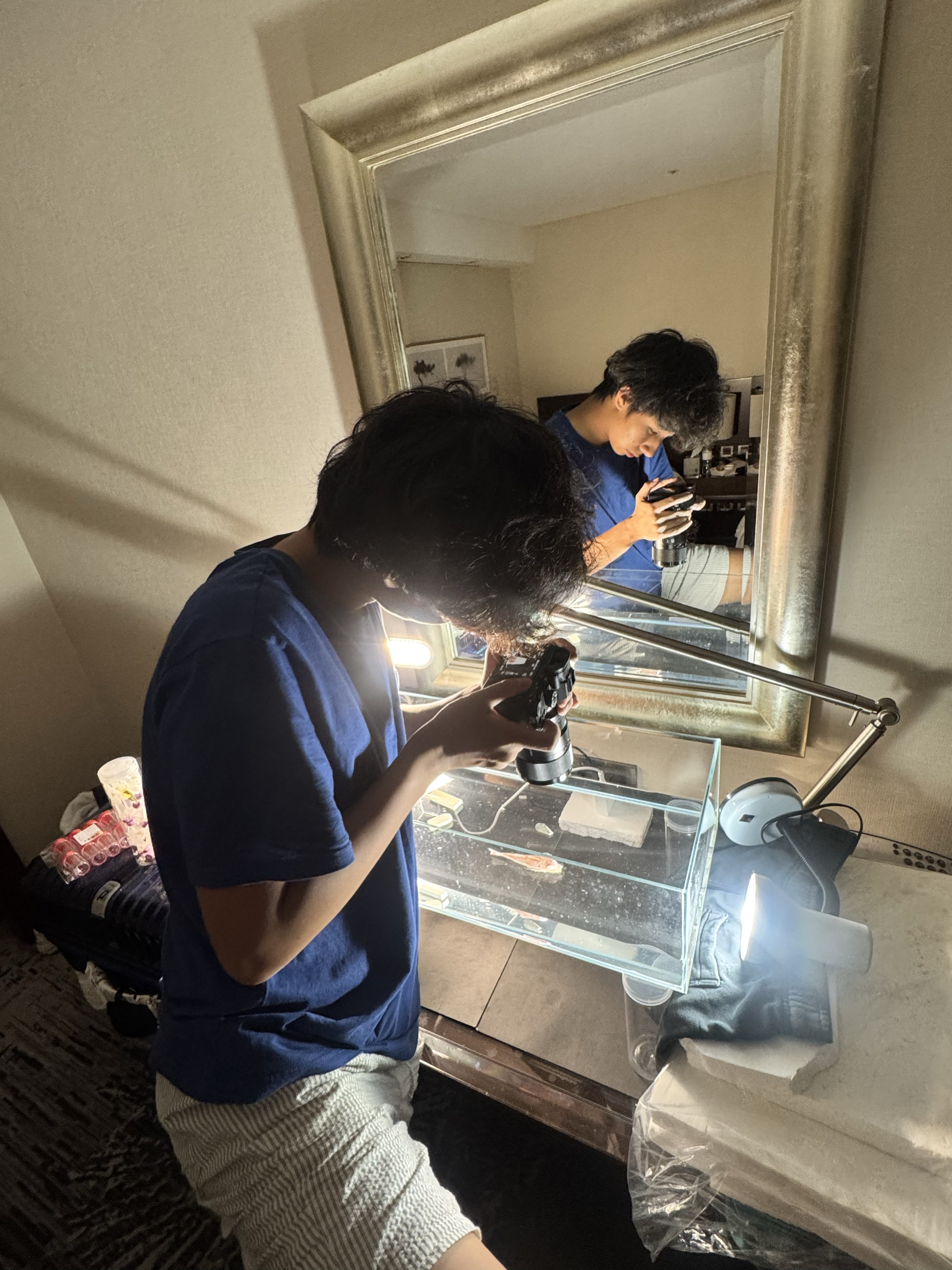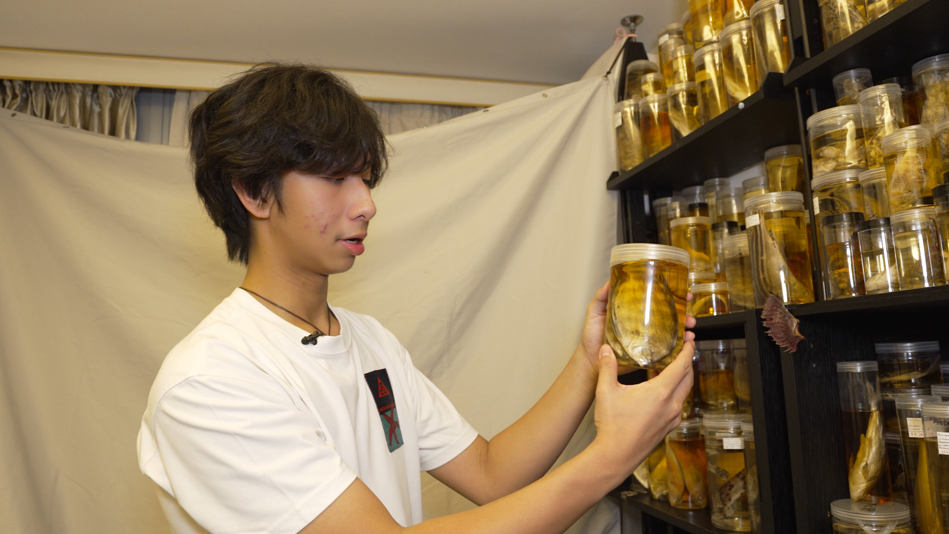 在這位「追魚少年」的身後,則是一整面牆的魚標本,那些大大小小、形態各異的魚浸泡在數不清的瓶瓶罐罐中,折射出暖黃色的光影,佔滿了整個房間,在玻璃與液體間流轉、折射,讓房間彷彿沉在海底。而這些,都是由這位燙着捲髮、高挑纖瘦的高中生親手製作,每一瓶都是他如數家珍的寶貝。