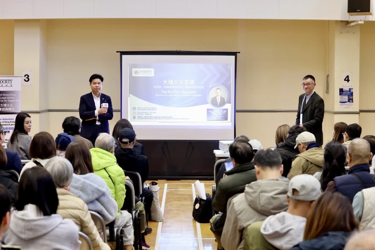 日前,香港律師會假大埔策誠軒舉行「大埔火災支援—立法會議員見面交流會」,向災民介紹現有援助措施以及特區政府和立法會即將展開的支援工作,為受火災影響的災民提供免費法律諮詢服務,協助他們處理災後面臨的各種法律問題。期間,律師會會長湯文龍、立法會議員蘇紹聰與受災居民直接交流。