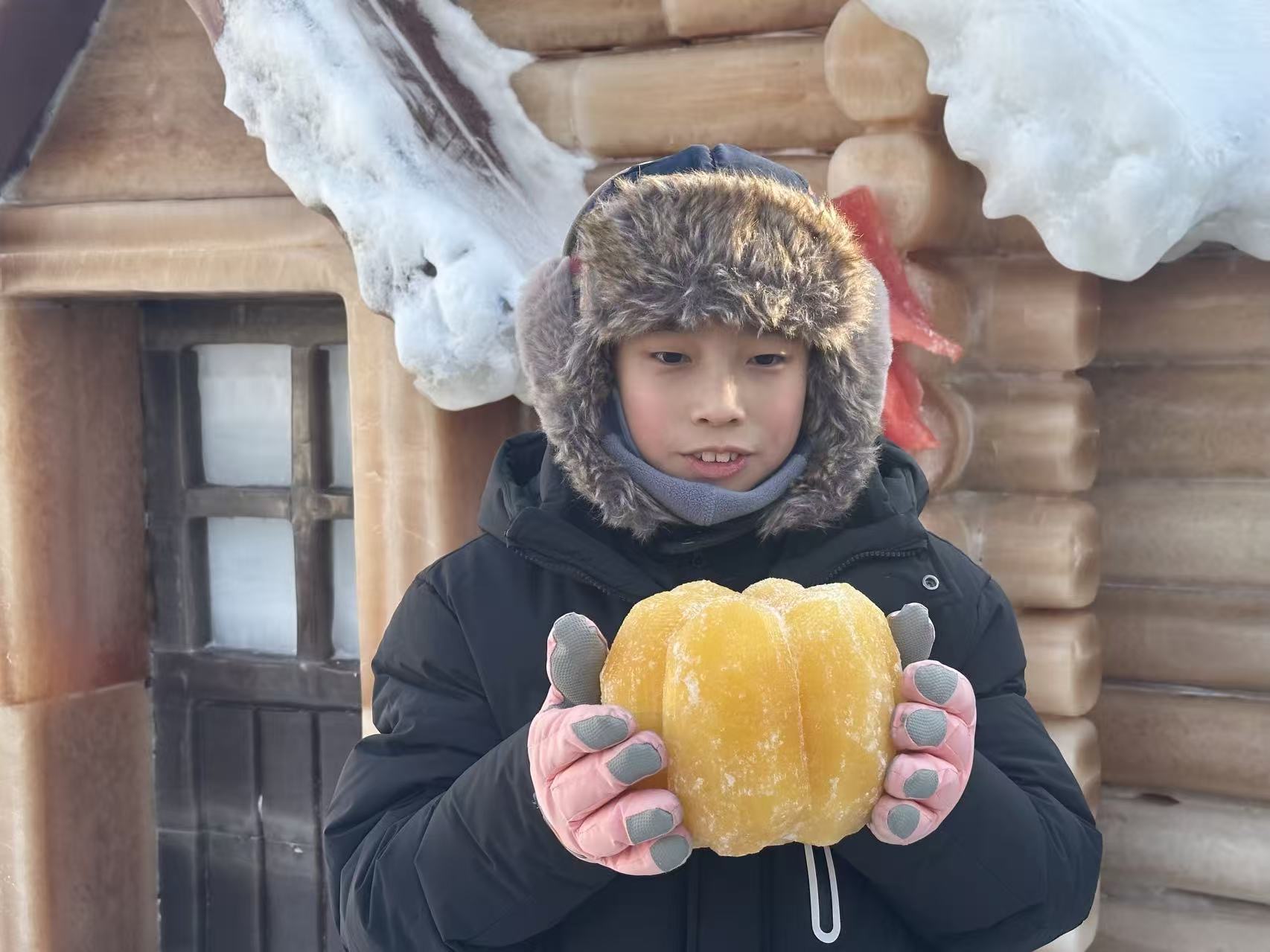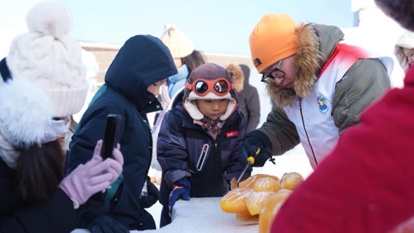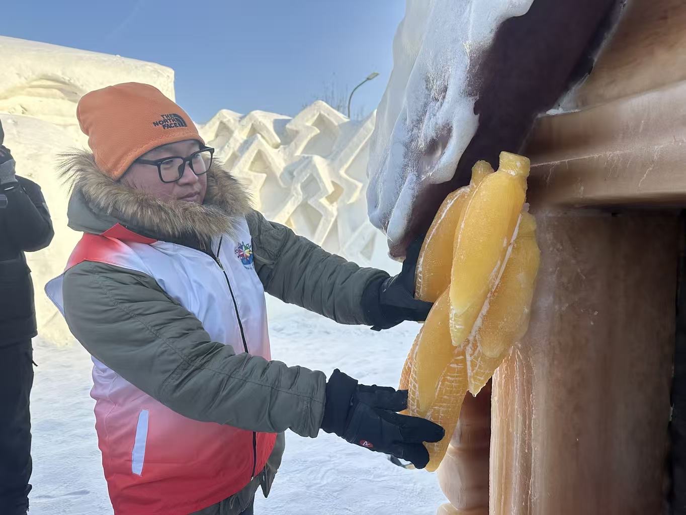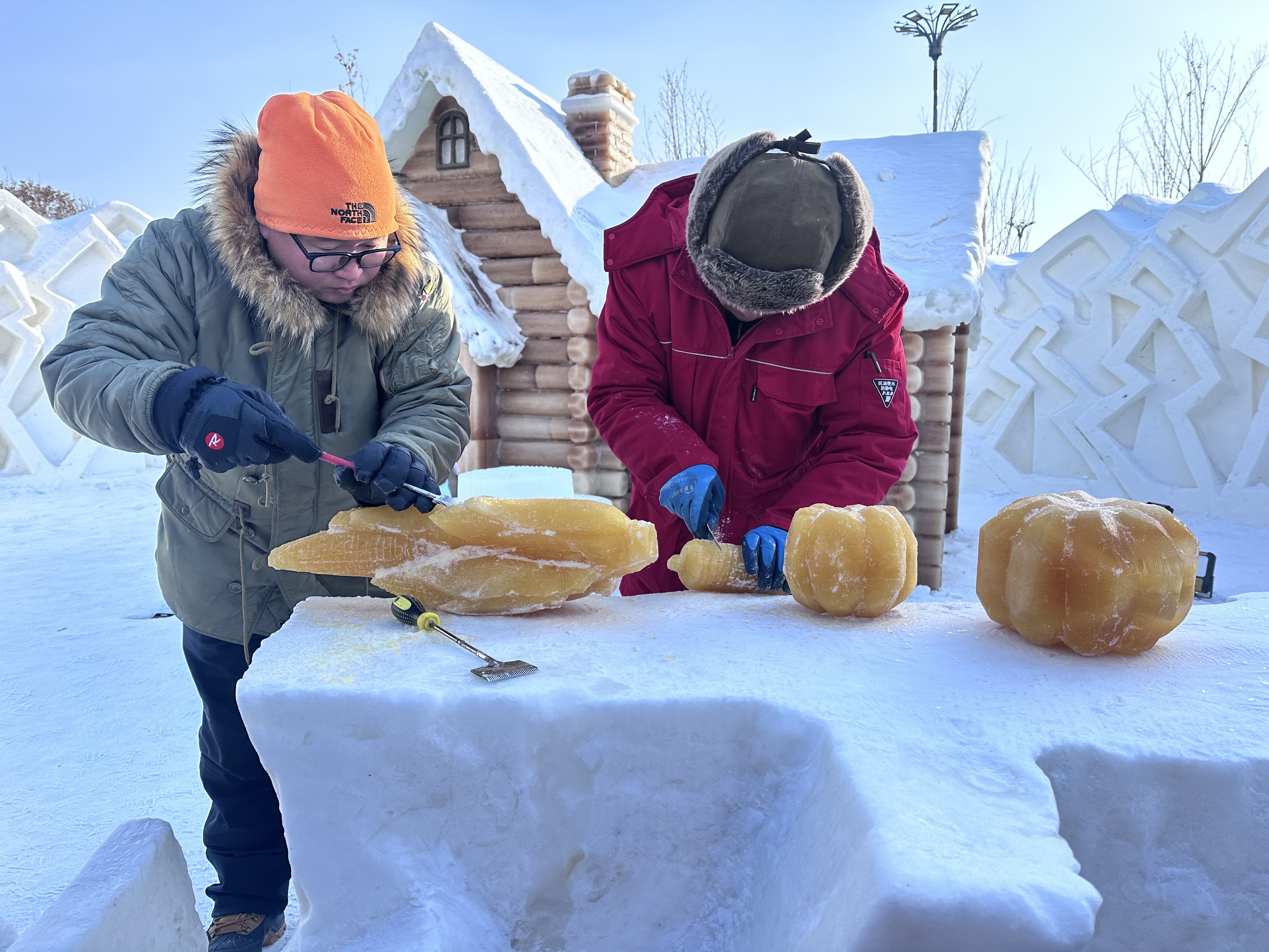 為了打造濃厚的東北文化氛圍,雕刻師們採用植物彩色冰現場雕刻出玉米、南瓜、辣椒等作品,玉米粒顆顆飽滿、南瓜色澤鮮艷逼真,遊客們捧在手裏體驗,愛不釋手。