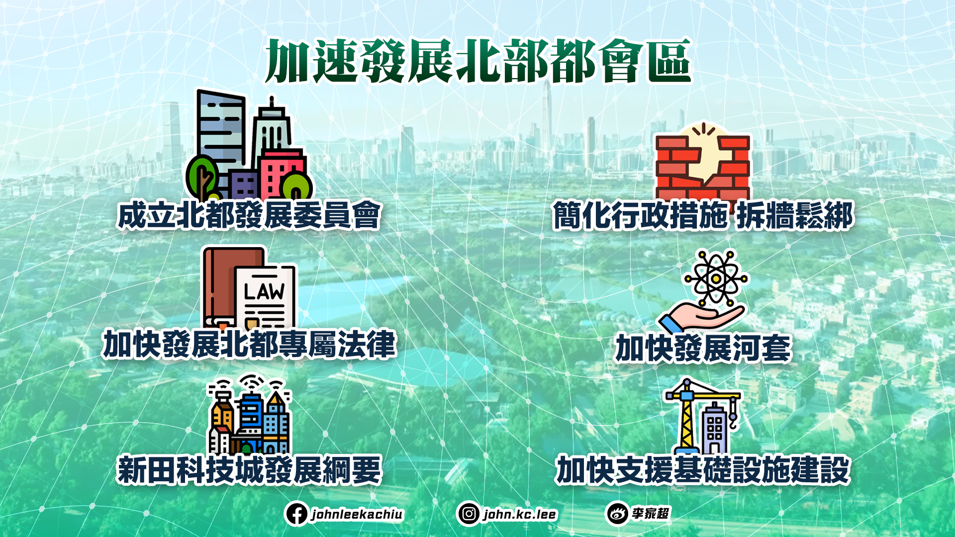 行政長官李家超多次以「心急如焚」形容自己推動北部都會區建設的迫切心情。2025年4月,行政長官會同行政會議批准北環綫主綫方案,隨後特區政府與港鐵簽訂合作協議。9月,施政報告宣布成立「北部都會區發展委員會」,由行政長官擔任主席,以提升決策層級。政府將簡化行政程序,引入專門法規吸引企業入駐。11月,《新田科技城創科產業發展規劃概念綱要》公布,計劃成立專屬公司,聯合市場力量共同參與開發。12月22日,河套創科園香港園區正式開園,已吸引逾60家企業和機構陸續進駐。
