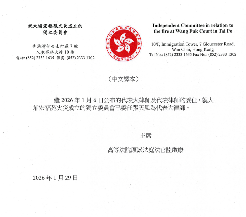 大公文匯全媒體報道,去年發生的大埔宏福苑大火死傷慘重,行政長官李家超早前宣布成立獨立委員會,審視事故原因及相關問題,並提出建議,由陸啟康擔任獨立委員會主席。委員會早前委任5位代表大律師,根據獨立委員會網頁今日(29日)最新通告,再委任張天風為代表大律師。