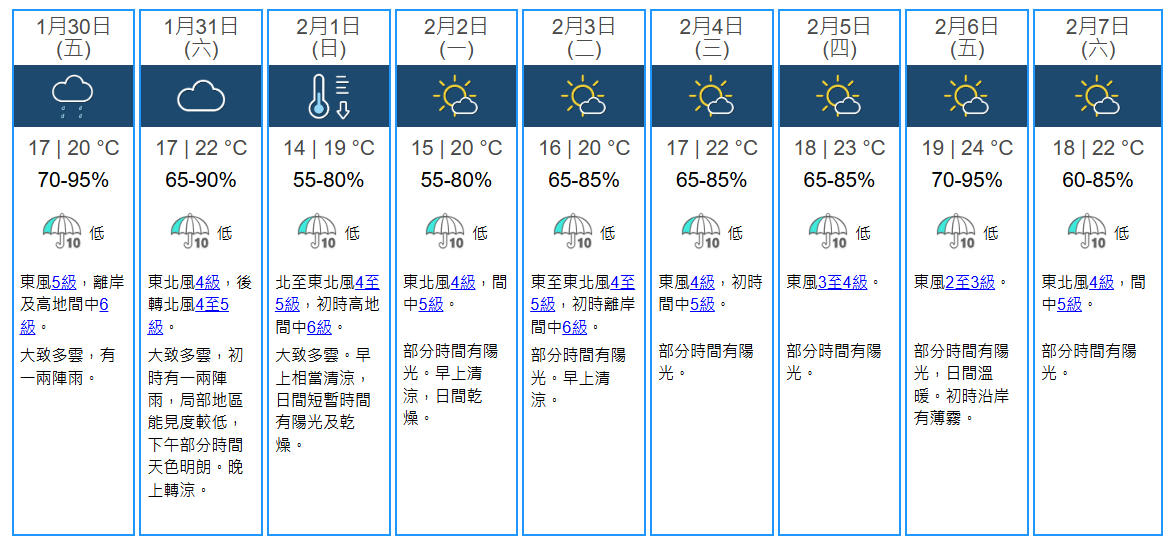 大公文匯全媒體報道,天文台預測,本港明日(30日)大致多雲,有一兩陣雨。氣溫介乎17至20度。吹清勁偏東風,離岸及高地間中吹強風。展望周六(1月31日)稍後漸轉吹偏北風,晚上天氣轉涼。隨後一兩日市區最低氣溫約14、15度,新界再低幾度,部分時間有陽光。