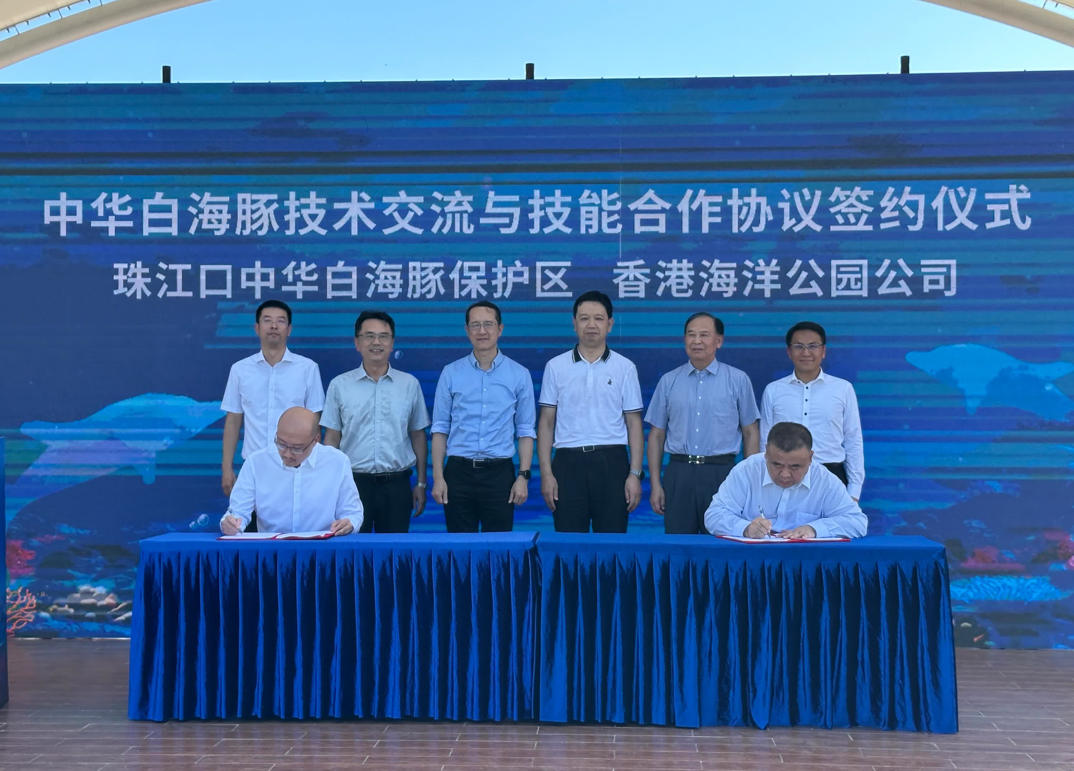 香港是珠江口海豚種群東緣棲息地的一小部份,因此區域協作對海洋保育同樣重要。漁護署近期與廣東珠江口中華白海豚國家級自然保護區管理局(管理局)簽署了《粤港中華白海豚保護合作平台備忘錄》,旨在深化粵港兩地交流,以協作保護棲息於珠江口水域的中華白海豚。海洋公園亦與管理局展開合作,善用團隊在鯨豚類動物的飼養、護理、繁殖和獸醫學方面的領先技術和經驗,加強大灣區内的技術交流、研究和在地保育工作,並推動公眾參與,為實踐《計劃》中的「伙伴協作」策略踏出了重要一步。