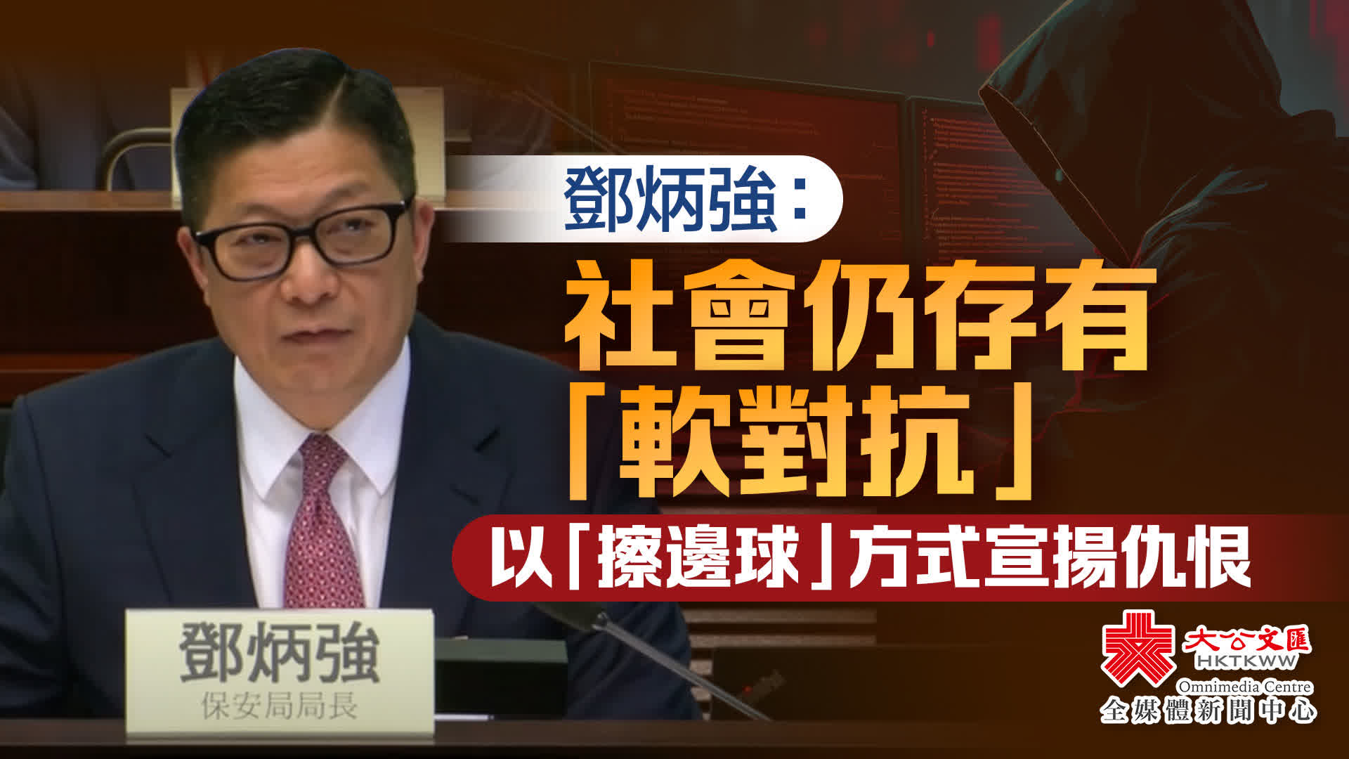鄧炳強說,當局面對國家安全風險不能掉以輕心,並指社會上仍存有「軟對抗」,有人用「擦邊球」的方式宣揚仇恨。他舉例指,在去年11月發生的宏福苑大火事件中,有人傳播假消息,揚言「將會有6000名防暴警鎮壓災民、消防和救護無飯食、關愛隊搶物資」等。鄧炳強強調這些都是假消息,目的是為了利用社會災難及市民不穩定的情緒煽動仇恨。
