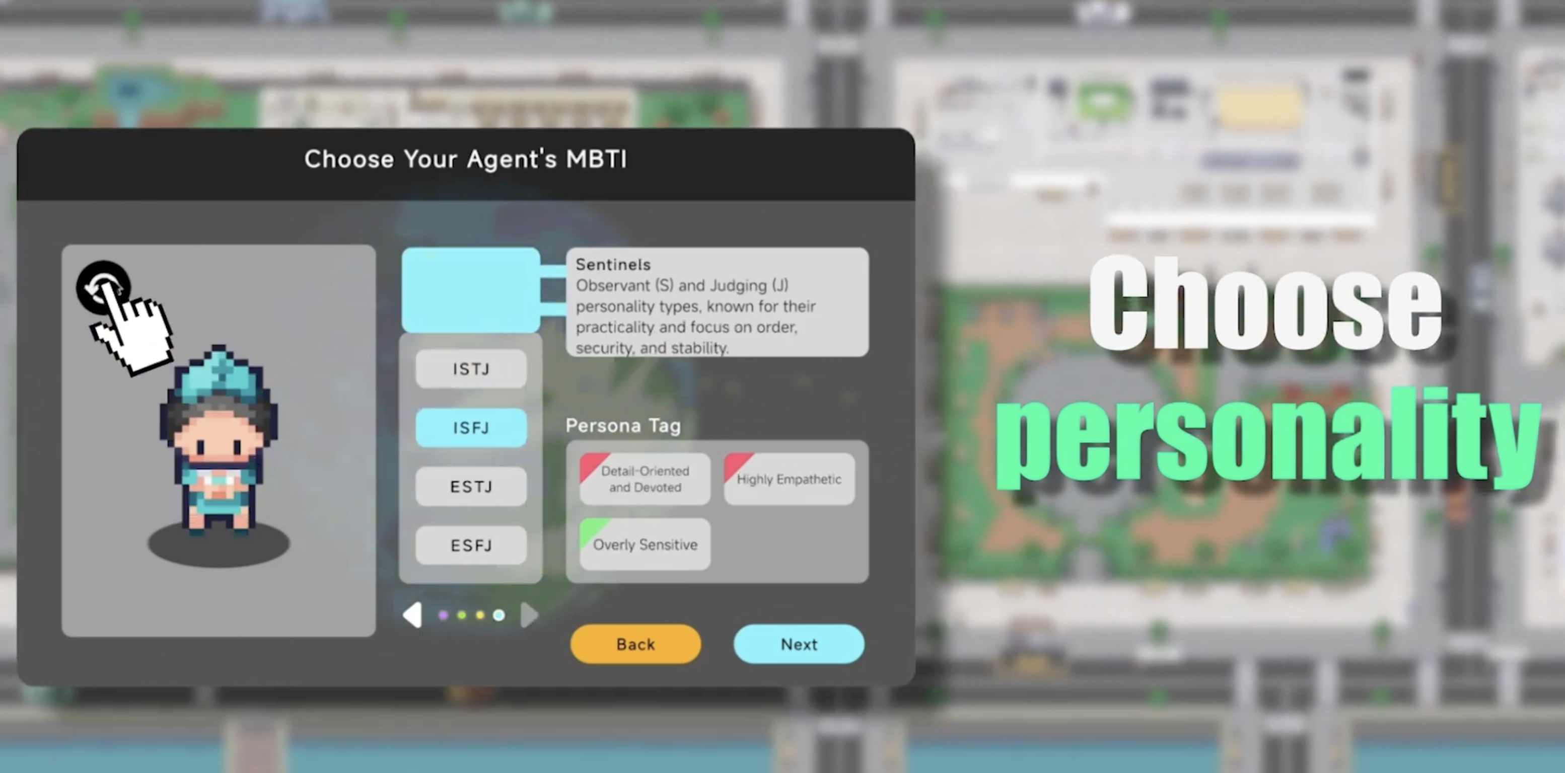 在遊戲開始前,玩家可以為智能體設定外觀和MBTI(16型人格)性格、興趣與行為偏好等參數,並通過指令影響其思考與生活模式。在智能體成長過程中,玩家亦可調整溝通策略,並針對升學、求職與人際關係等,向智能體提供建議及指導。該模擬社會高度仿真,涵蓋經濟、工業、政治、社交等多個領域,為玩家提供真實的社會運作體驗,同時收集高質量數據,助力人工智能研究。最後,玩家將收到一份AI角色的「人生報告」,詳述其於財富、工作發展、生活滿意度、技能知識、社交關係等發展。