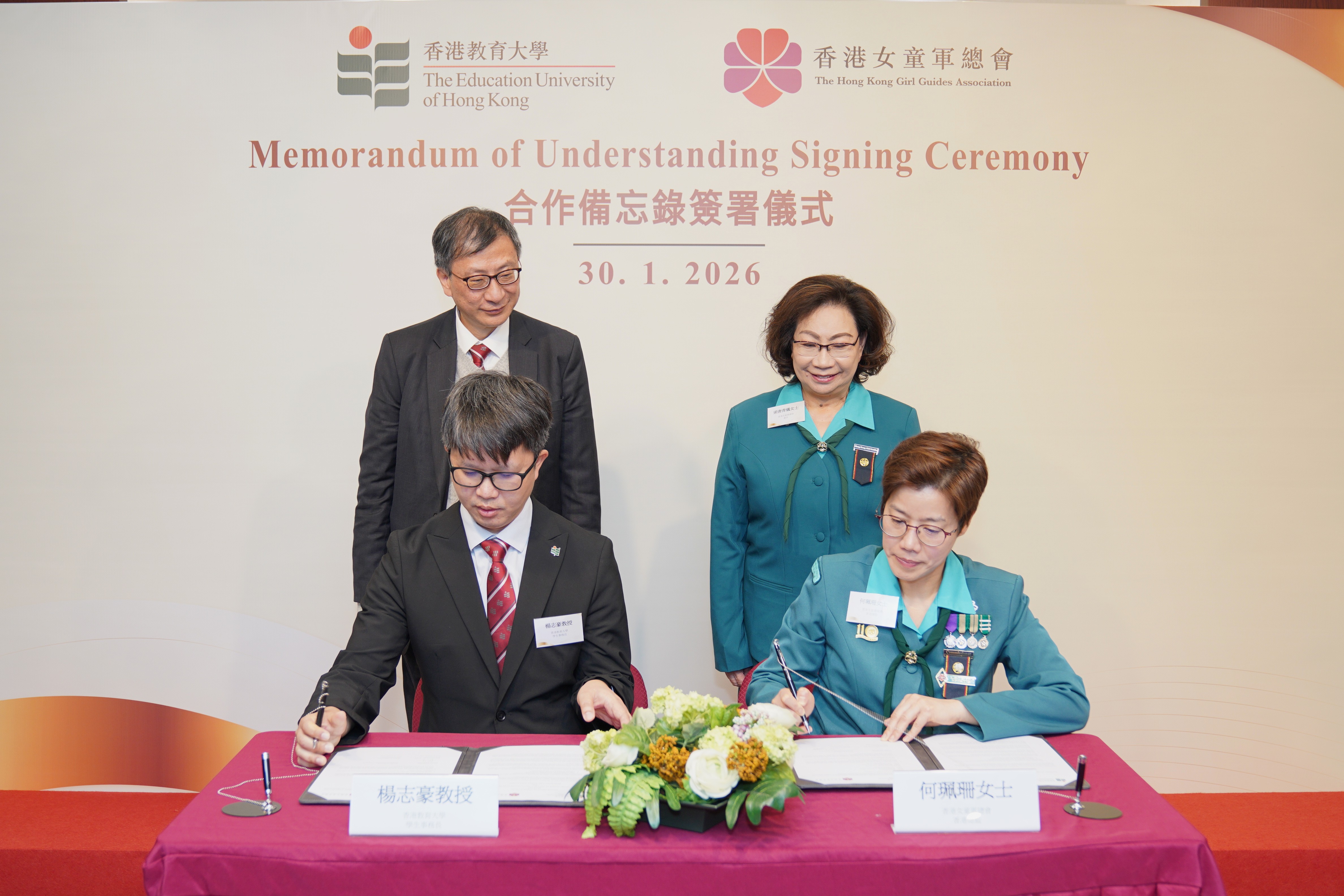 香港教育大學(教大)與香港女童軍總會(女童軍)今日(1月30日)於教大大埔校園舉行簽署儀式,正式簽訂合作備忘錄,攜手推動領袖培訓並深化雙方合作。是次簽署由教大校長李子建教授及女童軍會長梁唐青儀女士共同見證,並由教大學生事務長楊志豪教授及女童軍香港總監何珮珊女士代表簽署。