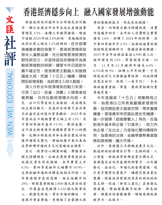 特區政府統計處昨日公布預先估計數字,顯示本港去年全年本地生產總值實質增長3.5%,連續三年錄得擴張,增速不僅較2024年的2.6%加快,更超越特區政府此前上調至3.2%的預測。在外部環境複雜多變的背景下,香港經濟增長取得令人滿意成績,充分展現香港經濟的韌性與活力,亦是特區政府積極作為推動經濟復甦的明證。儘管今年仍面對外圍不確定性,香港需更主動融入和服務國家大局,把握「十五五」機遇,積極開拓新增長點,為經濟注入持久動能。