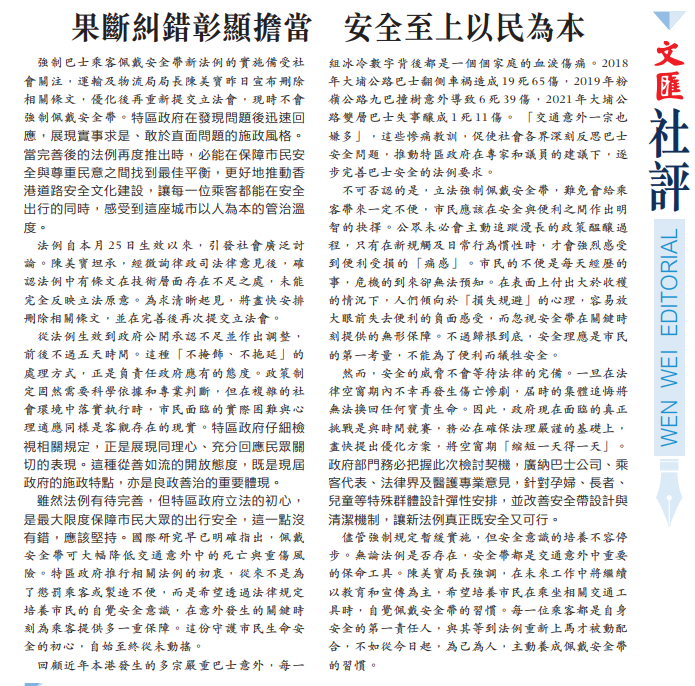 強制巴士乘客佩戴安全帶新法例的實施備受社會關注,運輸及物流局局長陳美寶昨日宣布刪除相關條文,優化後再重新提交立法會,現時不會強制佩戴安全帶。特區政府在發現問題後迅速回應,展現實事求是、敢於直面問題的施政風格。當完善後的法例再度推出時,必能在保障市民安全與尊重民意之間找到最佳平衡,更好地推動香港道路安全文化建設,讓每一位乘客都能在安全出行的同時,感受到這座城市以人為本的管治溫度。