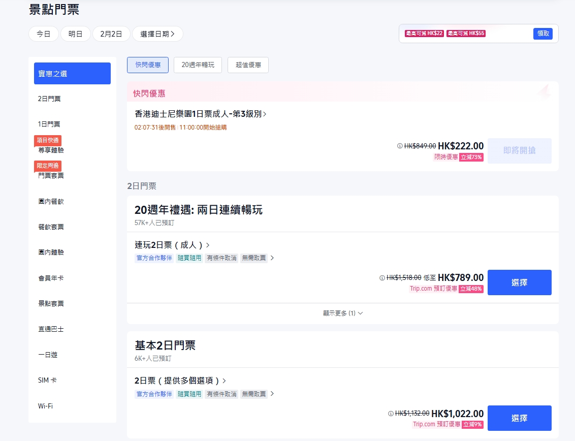 Trip.com於1月31日上午11時推出快閃優惠,Tier 3的一日門票只需$222一張,對比原價$849,低至26折優惠。此外,Trip.com亦同步推出香港迪士尼樂園指定門票減$50優惠,滿$1000即可使用。