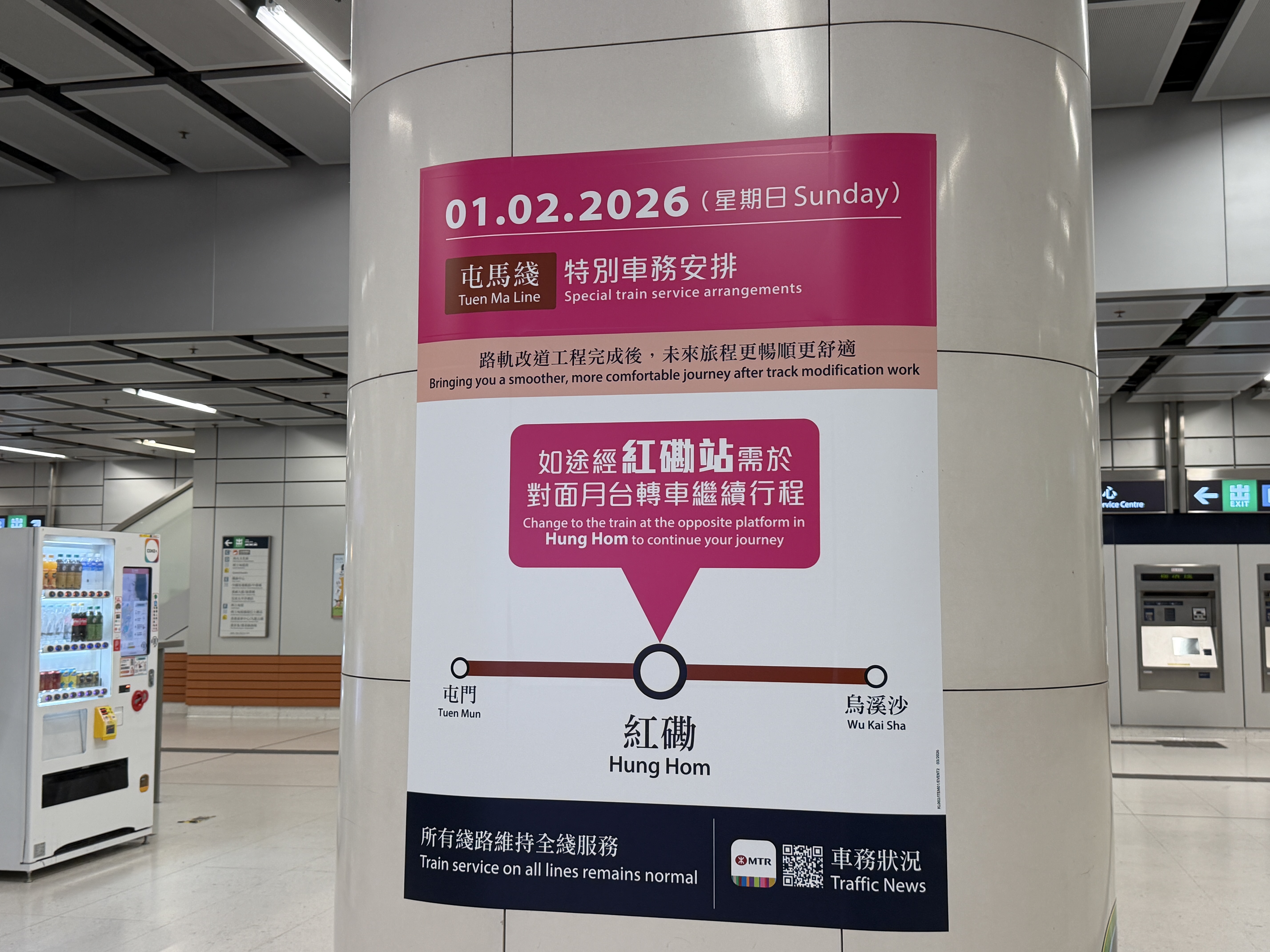 大公文匯全媒體報道,港鐵屯馬綫紅磡站至尖東站之間將進行路軌改道的跟進工序,部分路段需要短暫封閉,屯馬綫明日(2月1日)將實施特別服務安排。當日屯馬綫將維持全綫列車服務及正常班次,但途經紅磡站的乘客需於該站下車,轉往對面月台繼續乘車。