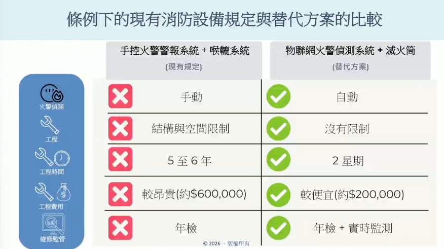 消防處消防安全總區樓宇改善課高級消防隊長蘇津鋒表示,消防處於2025年引進「物聯網火警偵測系統」先導計劃,提升舊式樓宇消防安全水平。與現有消防設備規定相比,最新的替代方案在火警偵測、工程時間和費用、維修監管方面更有優勢。可以協助消防在無人察覺的情況下,盡快派出人手去到有火警發生的樓宇。他表示,如果計劃效果理想,消防處會考慮讓「物聯網火警偵測系統」在所有相關樓宇應用。