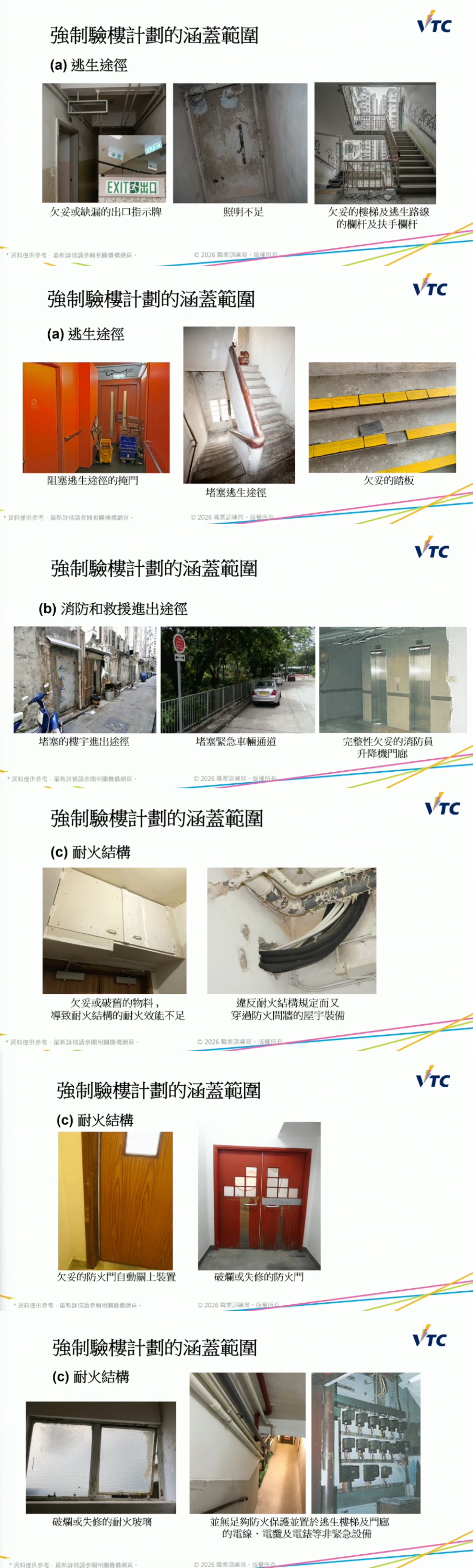 香港專業教育學院高級講師張耀基分享了強制驗樓計劃相關知識,他提到,在檢驗防火安全構件時,樓宇公用部分及外牆的所有消防安全設施當中須包括逃生途徑、消防和救援進出途徑以及耐火結構。他舉例指出不少常見隱患,包括耐火玻璃失修、照明不足、逃生路線欄杆損壞等,這些在日常生活中可能只是小事一宗,但在實際逃生時卻會造成危險。