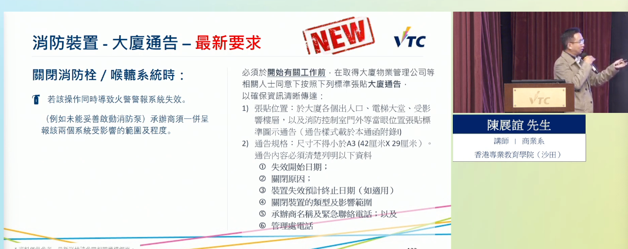 講座由VTC相關範疇專家主講,內容涵蓋多個重要範疇,包括住宅消防及建築安全法例及相關責任、政府強制驗樓計劃(MBIS)的要求;住宅基本消防裝置日常維護;建築物及防火物料的測試標準及認可檢測機構簡介;以及住宅物業日常安全管理及事故應變策略,讓參加者了解更多樓宇消防安全的相關資訊。