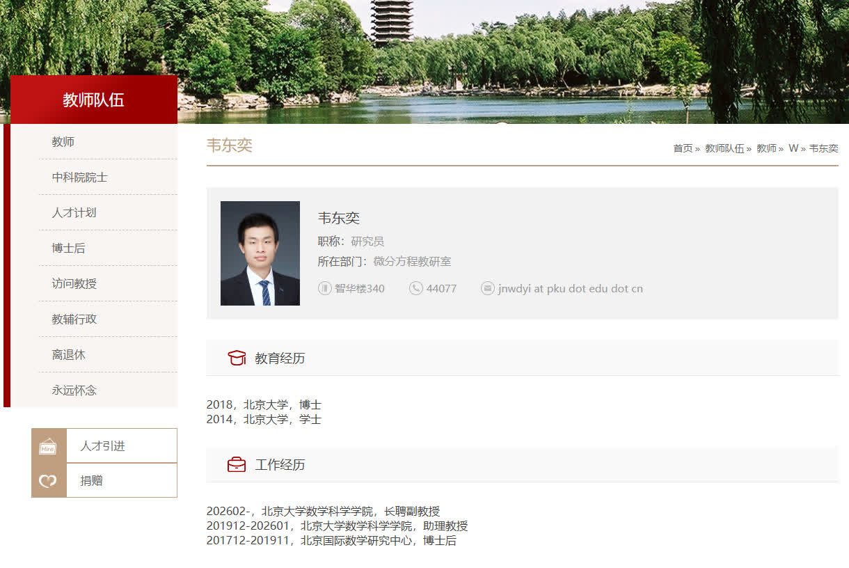 據光明日報消息,根據北京大學數學科學學院網站信息,從2026年2月起,該院教師韋東奕正式獲聘北京大學長聘副教授。