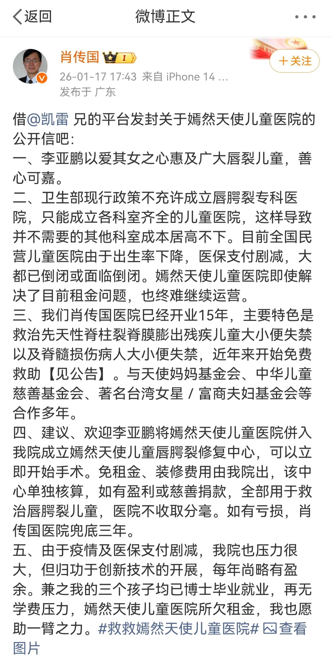 肖傳國指出,嫣然作為綜合性兒童醫院,運營非核心科室導致成本高企,而專科化運營可高效整合資源、提升效率,實現可持續發展。他表示,其醫院已專注先天性脊柱裂救治15年,並長期與慈善基金會合作,具備承接能力,亦理解運營民營醫院的不易,因此願在能力範圍內提供幫助。