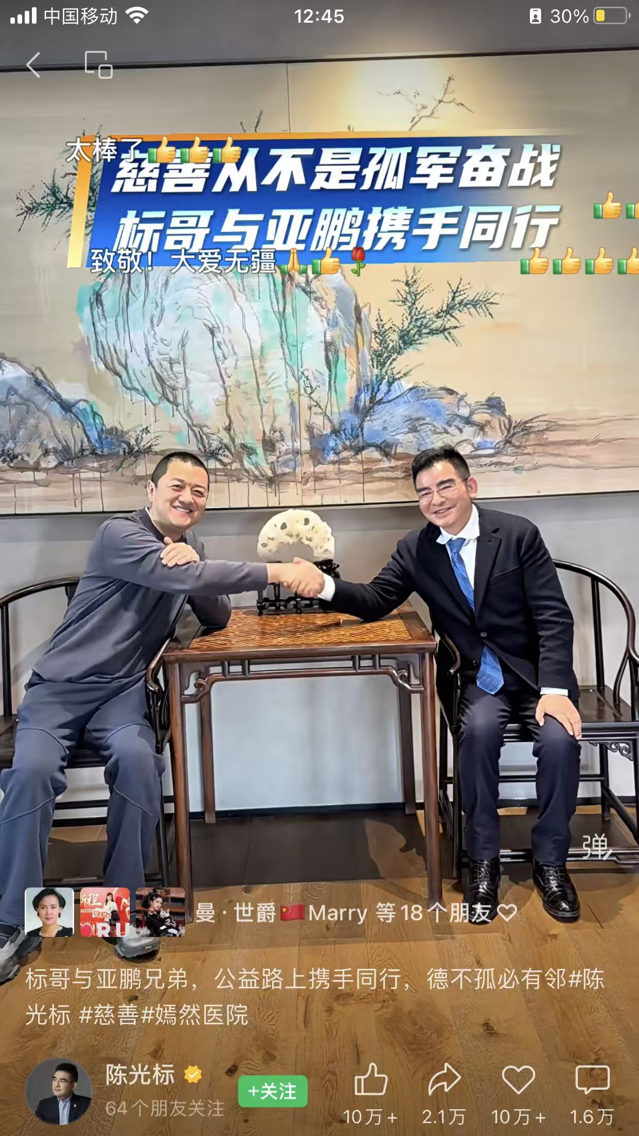 慈善家陳光標則於1月19日高調回應,提出兩套方案,一是向醫院或李亞鵬提供收款賬戶,承諾48小時內捐贈超1300萬元並全程公開轉賬;二是若資助未果,願按市場價全資收購醫院,保留其公益屬性,並組建專業團隊確保治療不斷檔。同時,他還建議由李亞鵬邀請王菲舉辦慈善演唱會,陳光標本人承擔全部出場費用,所得收入亦將悉數捐贈。