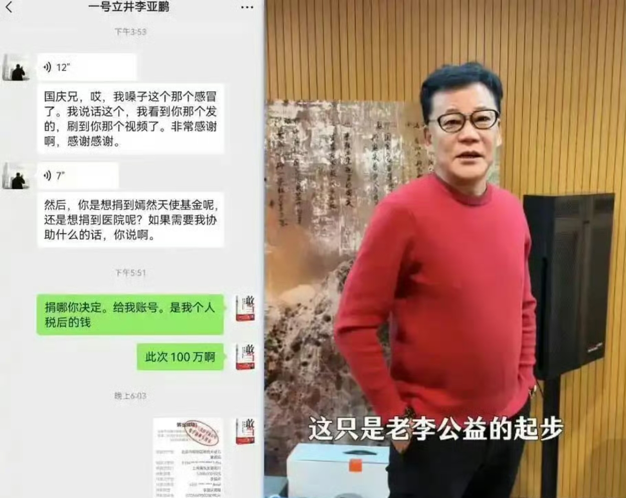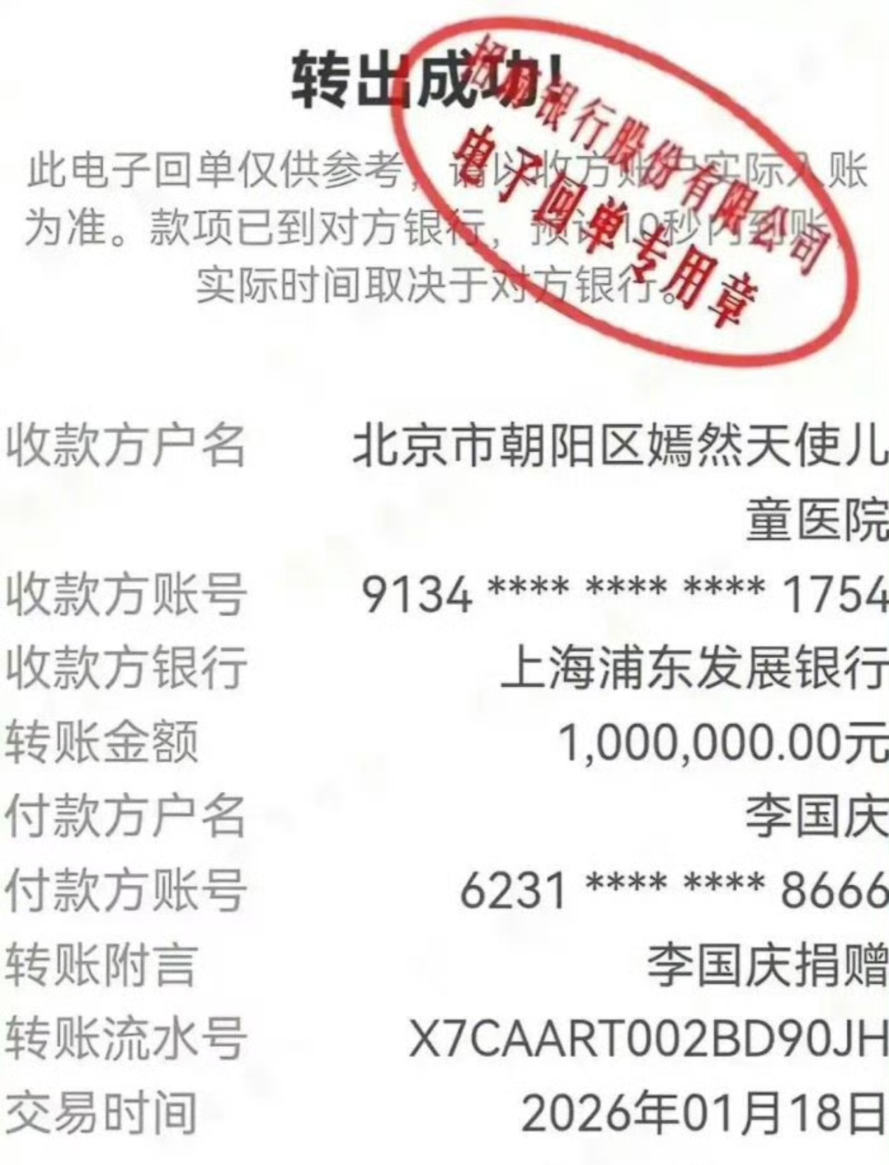 李國慶於1月17日宣布提前啟動原定2026年6月的公益計劃,捐資100萬元專項用於100台唇齶裂兒童手術及差旅費用,並於次日公開轉賬憑證。他在視頻中稱讚李亞鵬「厚道有遠見,總早於市場三五年行動」,強調此次捐助基於信任與務實支持,不附帶條件。