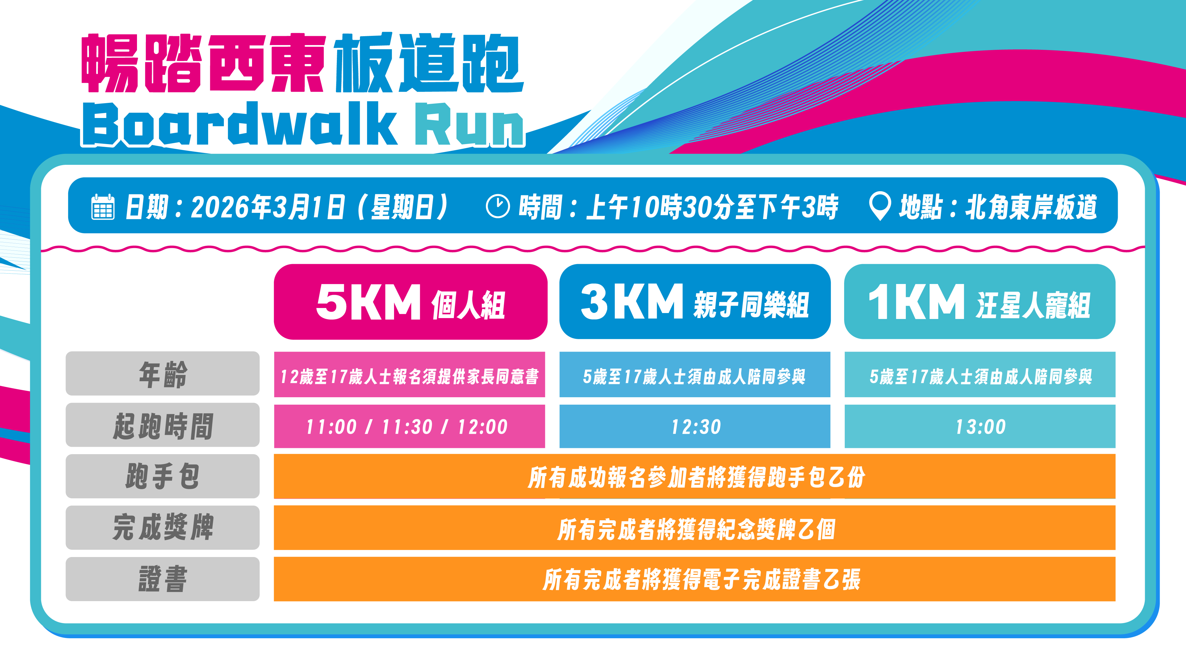 「暢踏西東板道跑」設有5公里個人組、3公里親子同樂組及1公里汪星人寵組,起點均設於北角東岸板道(東段)近電照街出入口,終點則設於板道最東端近鰂魚涌海裕街出入口。其中5公里組別參加者可沿東岸板道東西兩段,而3公里組別的路線集中在近月開放的板道東段。此次活動特設1公里汪星人寵組,參加者可牽繩同毛孩一起在東段暢跑,享受人寵同樂。