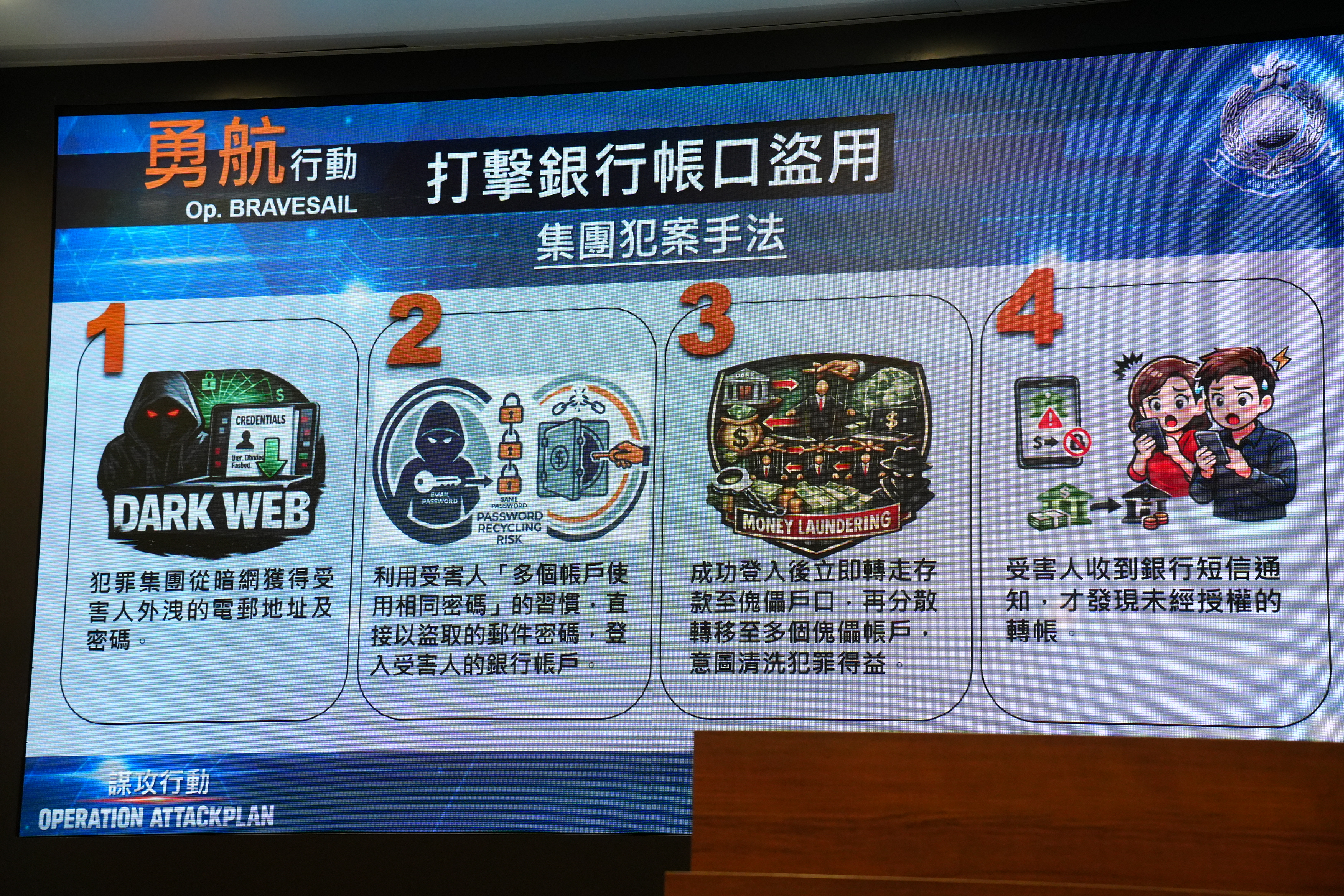 網絡安全及科技罪案調查科警司張巧儀分享執法成果。例如,警方接到受害人反映電郵資料在暗網上外洩,經深入調查後拘捕4男6女,年齡介乎18至67歲,包括2名操控傀儡戶口的人士,成功瓦解涉案的洗黑錢集團。她提醒市民,銀行密碼必須獨立設定,切勿與電郵或社交賬戶相同,定期更改密碼,以免讓匪徒有機可乘。