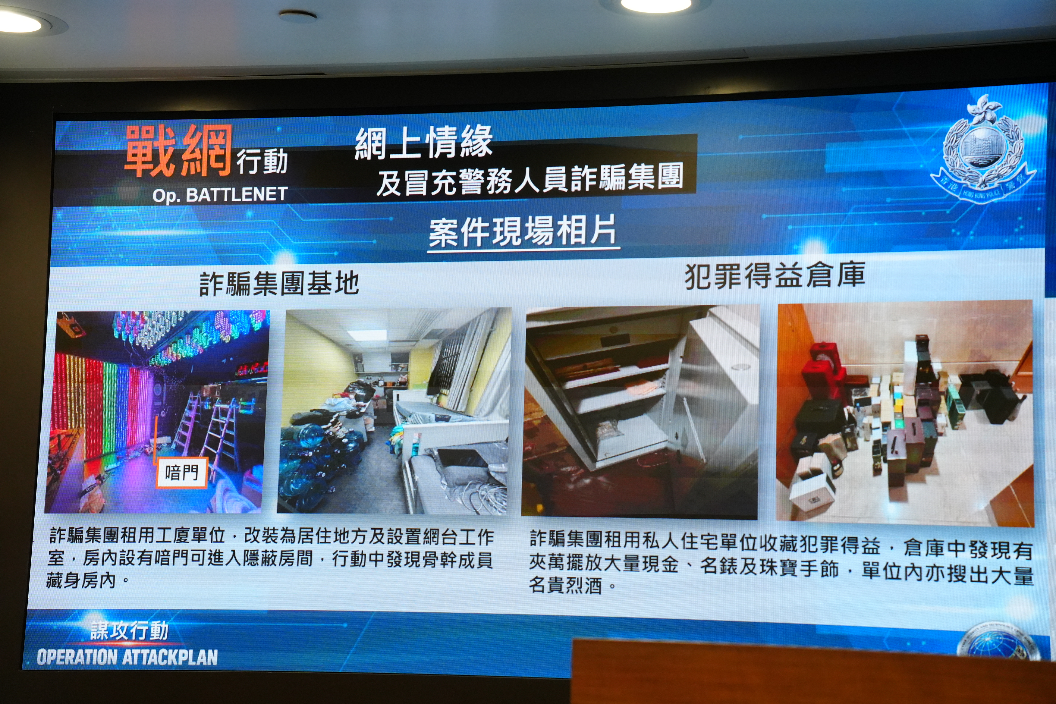 另一方面,警方亦接到網上情緣詐騙的報案,發現有犯罪集團以家庭式經營,租用工廠大廈單位處理業務,並將私人單位用作擺放資產。調查後,警方發現騙徒於交友程序假扮本地年輕女子,企圖引起受害人的同情心,同時又會假冒警務人員進行二次詐騙,再次打電話給受害人,訛稱案件已經被偵破,聲稱只要繳交行政費,便能取回騙款。警方提醒,警務人員不會要求市民支付任何費用以取回涉案財物,如有懷疑,請即致電「防騙易18222」熱線向反詐騙協調中心查詢。