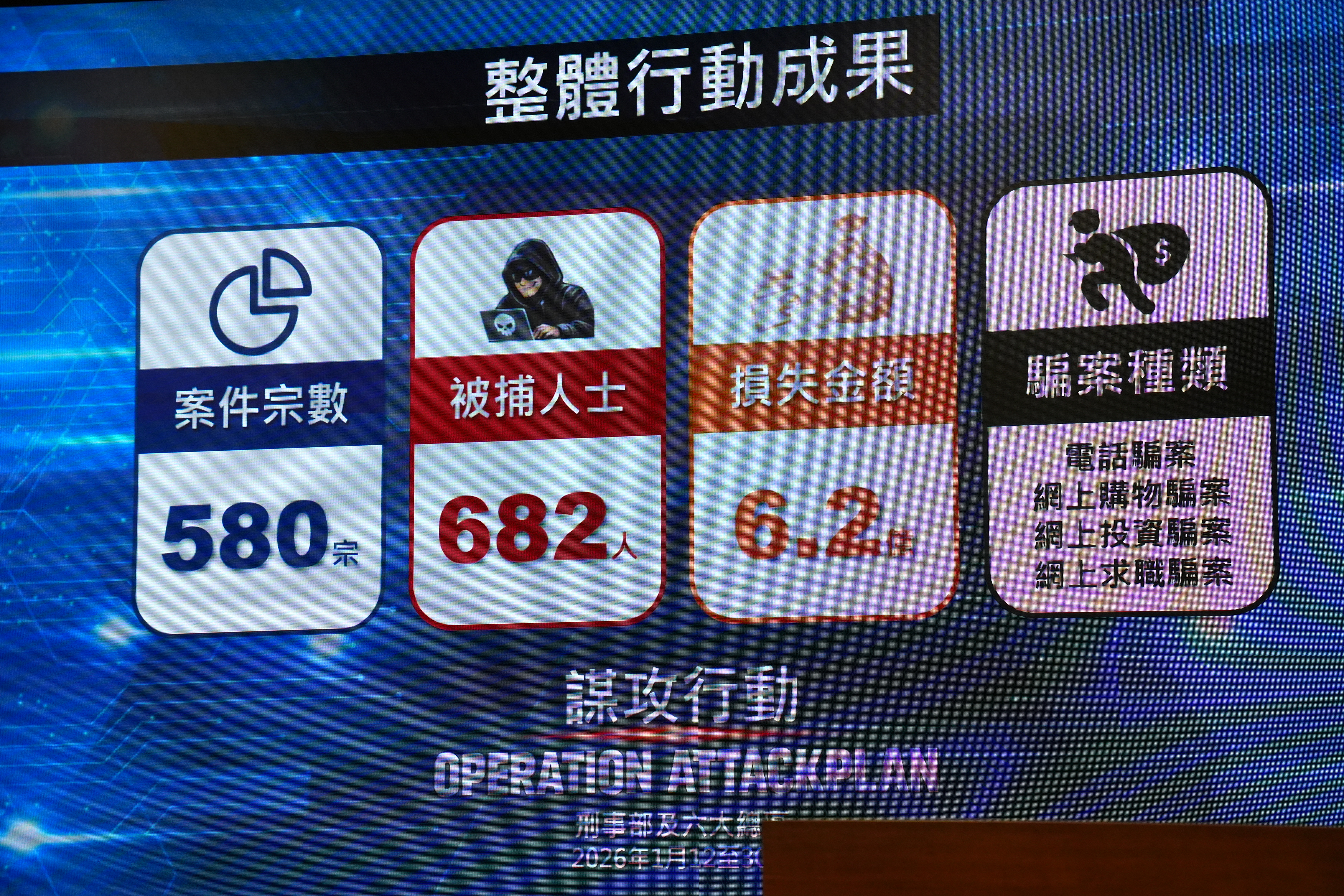 (大公文匯全媒體 記者 王俊傑)警方網絡安全及科技罪案調查科今日(2月2日)聯同商業罪案調查科與財富情報及調查科,簡介近期打擊騙案與科技罪案的成果。警方於過去三星期的全港性大型執法行動「謀攻」之中,拘捕682人,涉及580宗案件、涉案金額高達6.2億港元。