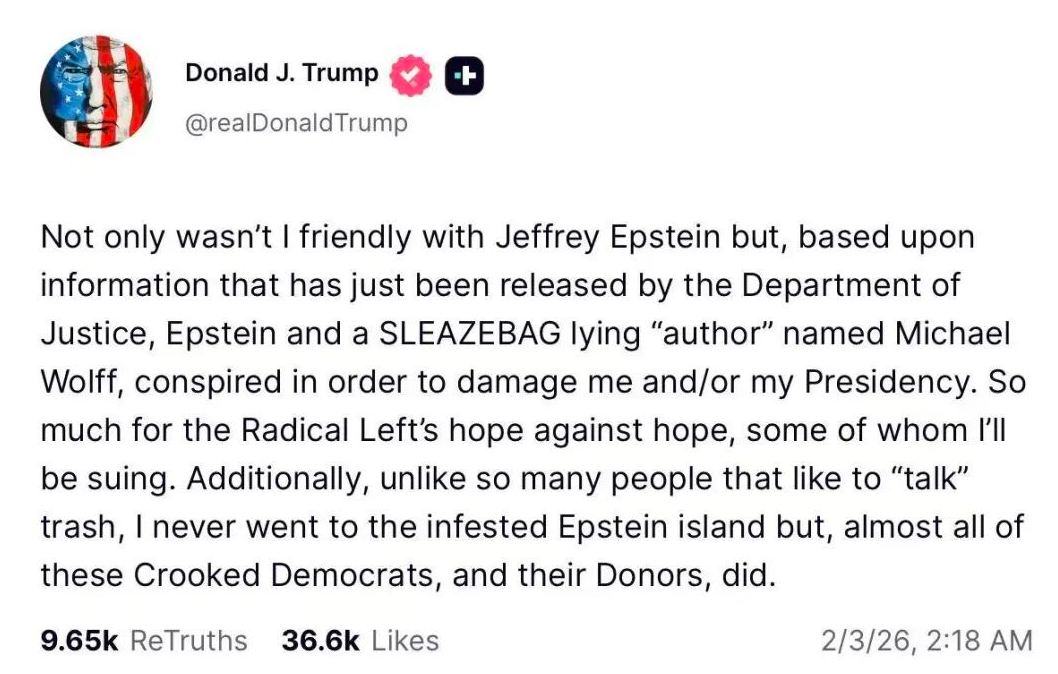 大公文匯全媒體報道,美國總統特朗普2日在社交媒體上發文,再次否認與美國已故富商愛潑斯坦的案件有關聯,稱從未去過愛潑斯坦的島嶼。