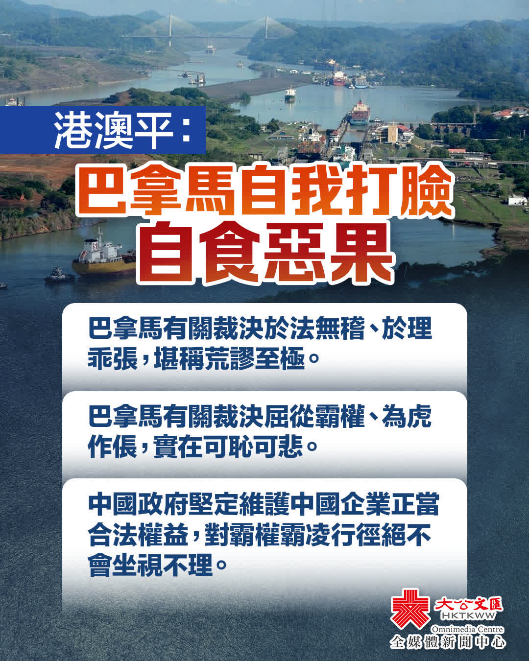 中央港澳工作辦公室、國務院港澳事務辦公室3日刊發「港澳平」署名文章《巴拿馬自我打臉自食惡果》,文章指出:日前,巴拿馬最高法院以所謂「違憲」為由,裁決有關中國香港企業巴拿馬運河港口特許經營合約續約無效。有關裁決讓國際社會強烈感受到,該國的司法獨立已淪為笑話,無任何公信力可言。其如此做法,必嚴重損害巴拿馬與國際社會其他主體關係。歷史已反覆證明:任何國家若執意逆流而動,終將在世界進步浪潮中被拋棄,助紂為虐者也必遭反噬。以下為全文: