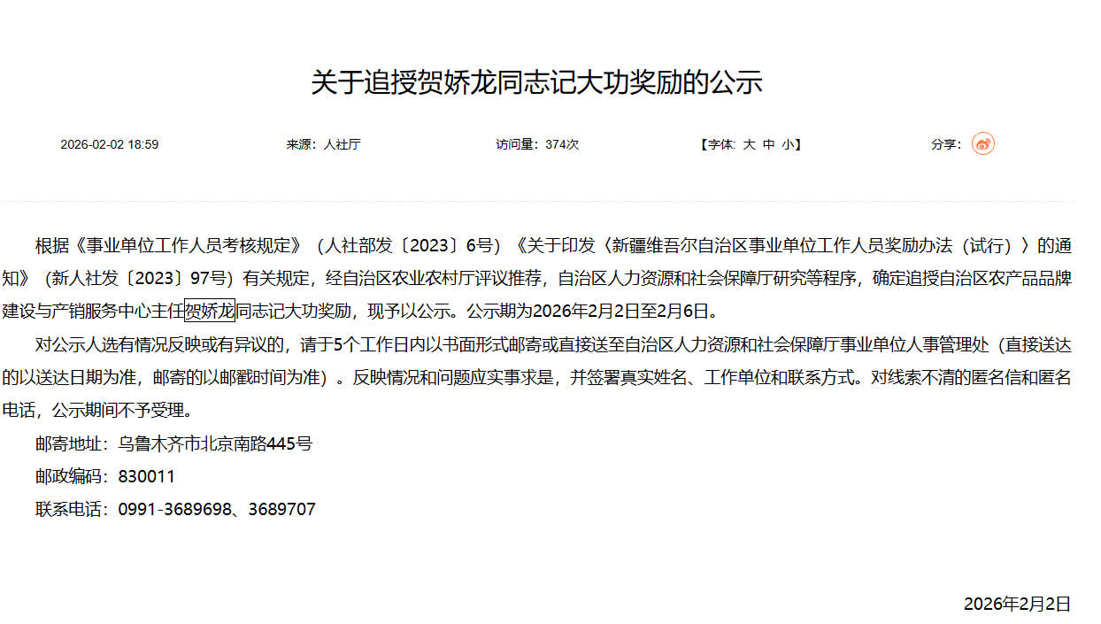 公示稱,根據有關規定,經自治區農業農村廳評議推薦,自治區人力資源和社會保障廳研究等程序,確定追授自治區農產品品牌建設與產銷服務中心主任賀嬌龍同志記大功獎勵,現予以公示。公示期為2026年2月2日至2月6日。
