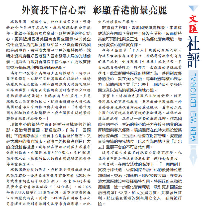 瑞銀集團「瑞銀中心」於昨日正式交接,預計將於今年第四季度啟用,成為瑞銀全新香港總部。此舉不僅彰顯國際金融巨頭對香港的堅定信心,更與近期香港美國商會調查顯示94%美企信任香港法治的數據相互印證,凸顯香港作為國際金融中心、粵港澳大灣區門戶的獨特優勢,說明外資高度看好香港融入國家發展大局的光明前景,用真金白銀對香港投下信心票,西方政客抹黑香港營商環境的謬論徹底破產。