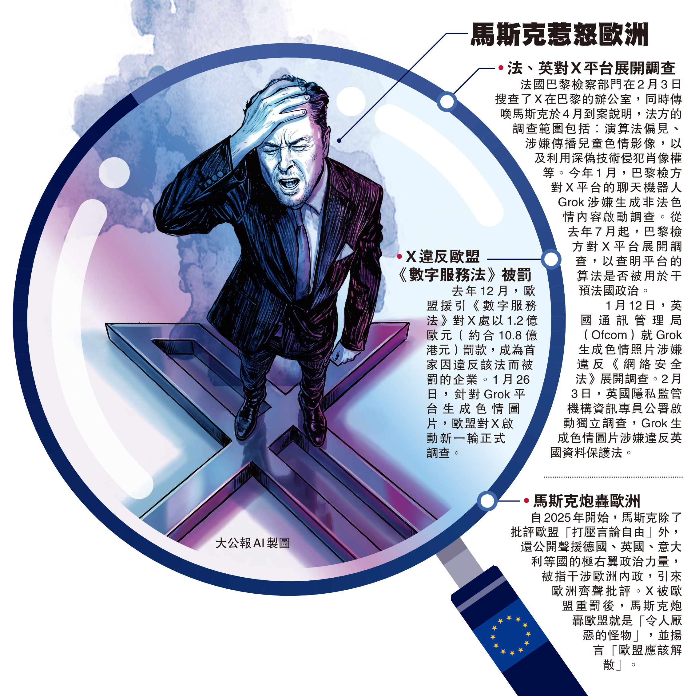 大公報報道,全球首富馬斯克旗下社交媒體平台X近期屢惹爭議,法國檢方3日突擊搜查了X位於巴黎的辦公室,並傳喚馬斯克在4月出席聽證會。英國隱私監管機構同日亦正式啟動對馬斯克旗下聊天機器人Grok展開新的調查。分析認為,馬斯克作為美國總統特朗普的盟友,成為歐盟反擊美國的目標對象,歐洲對X的調查恐加深美歐之間的分歧。