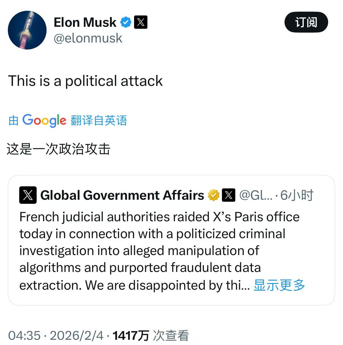 大公文匯全媒體報道,當地時間3日,法國巴黎檢察院表示,已對美國企業家埃隆·馬斯克旗下社交媒體平台X位於法國的辦公場所展開搜查。對此,馬斯克在X上回應稱,「這是一場政治攻擊」。他還在另一條帖文中表示,法國應將精力更多放在打擊性犯罪分子上。