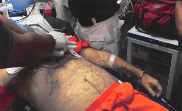 其中一份照片顯示,愛潑斯坦身穿的橙色囚服上衣被撕開,一名急救人員正試圖對他實施心肺復甦。另一張照片則呈現了愛潑斯坦面部駭人的紅腫狀態,以及其頸部留有深紅色勒痕的樣子。有照片顯示,愛潑斯坦的甲狀軟骨幾乎完全骨折。