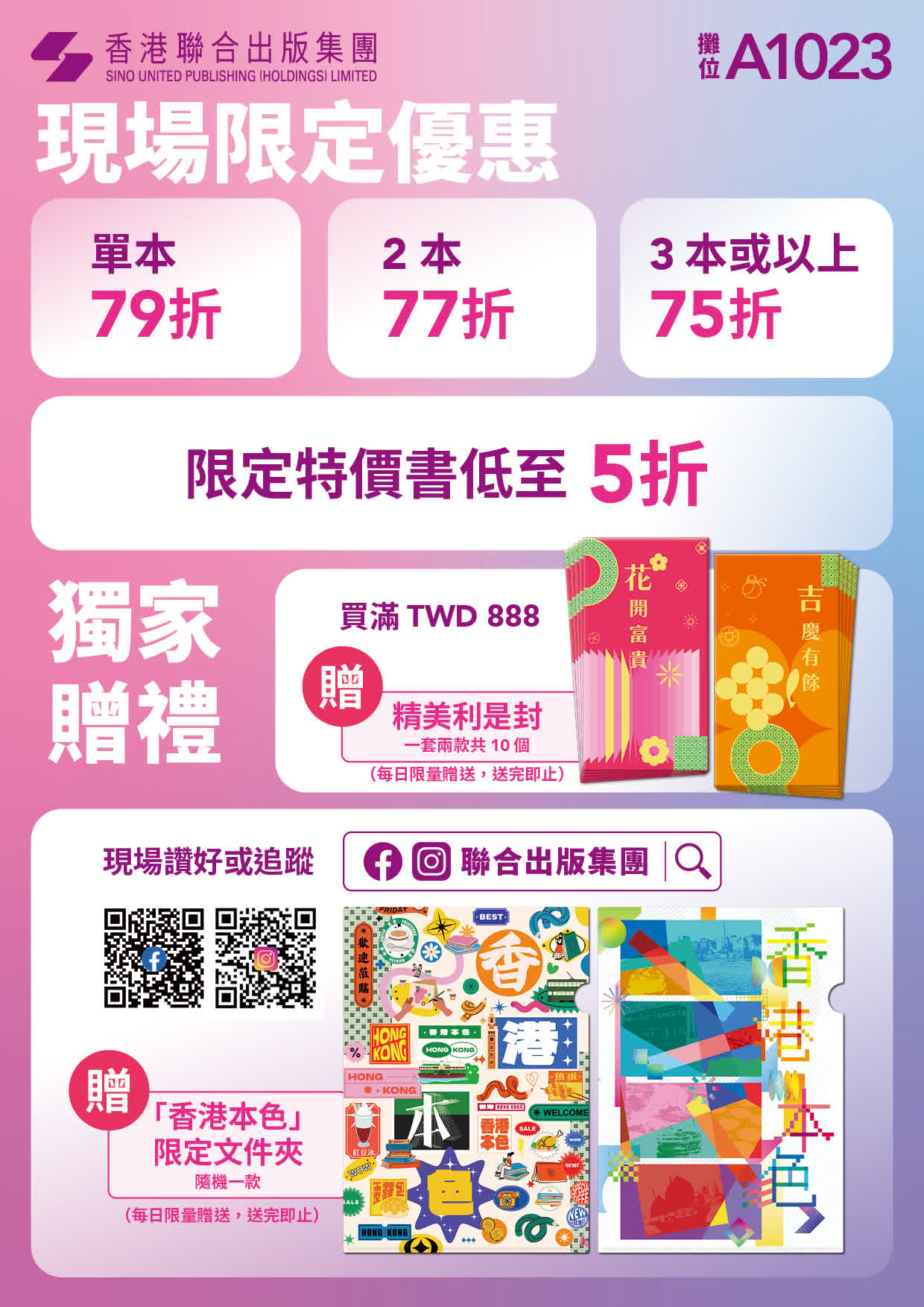 是次台北國際書展,聯合出版集團攤位全場圖書享有單本79折,2本77折,3本或以上75折優惠,還有一系列限定特價書以低至5折出售,機會難得,切勿錯過。讀者在現場購書,亦有機會獲得限定好禮,包括:凡買滿TWD888即可獲贈精美利是封一套(共10個)。現場讚好或追蹤聯合出版集團Facebook或Instagram(@sinounitedpublishing),即可獲贈「香港本色」限定文件夾。數量有限,送完即止!
