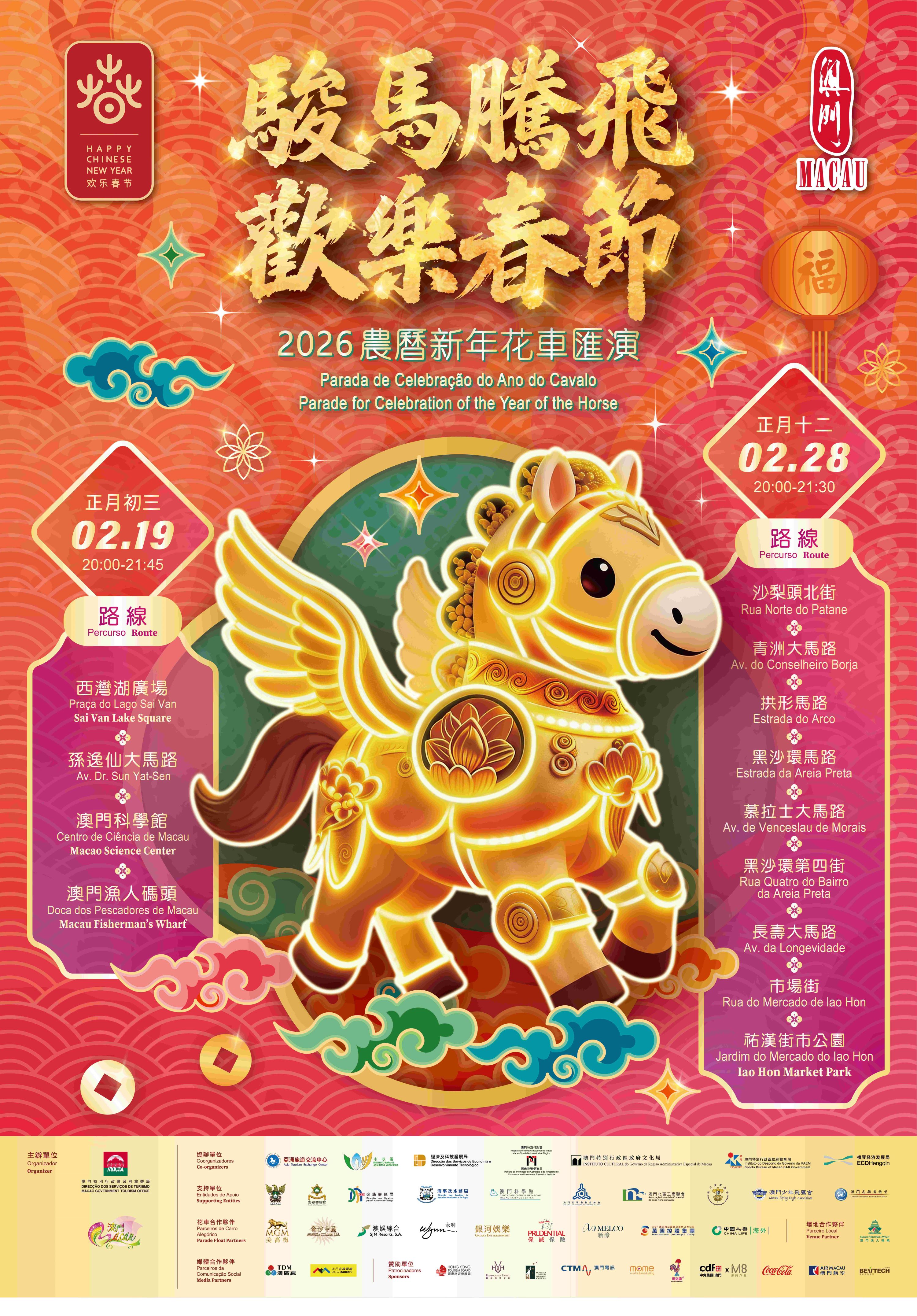 來自澳門、香港、內地、葡萄牙、西班牙、意大利、菲律賓及韓國約1300名表演者,聯同17部花車參與演出。花車將由西灣湖廣場起步,途經孫逸仙大馬路、澳門科學館,最終抵達澳門漁人碼頭,沿途送上新春祝福。