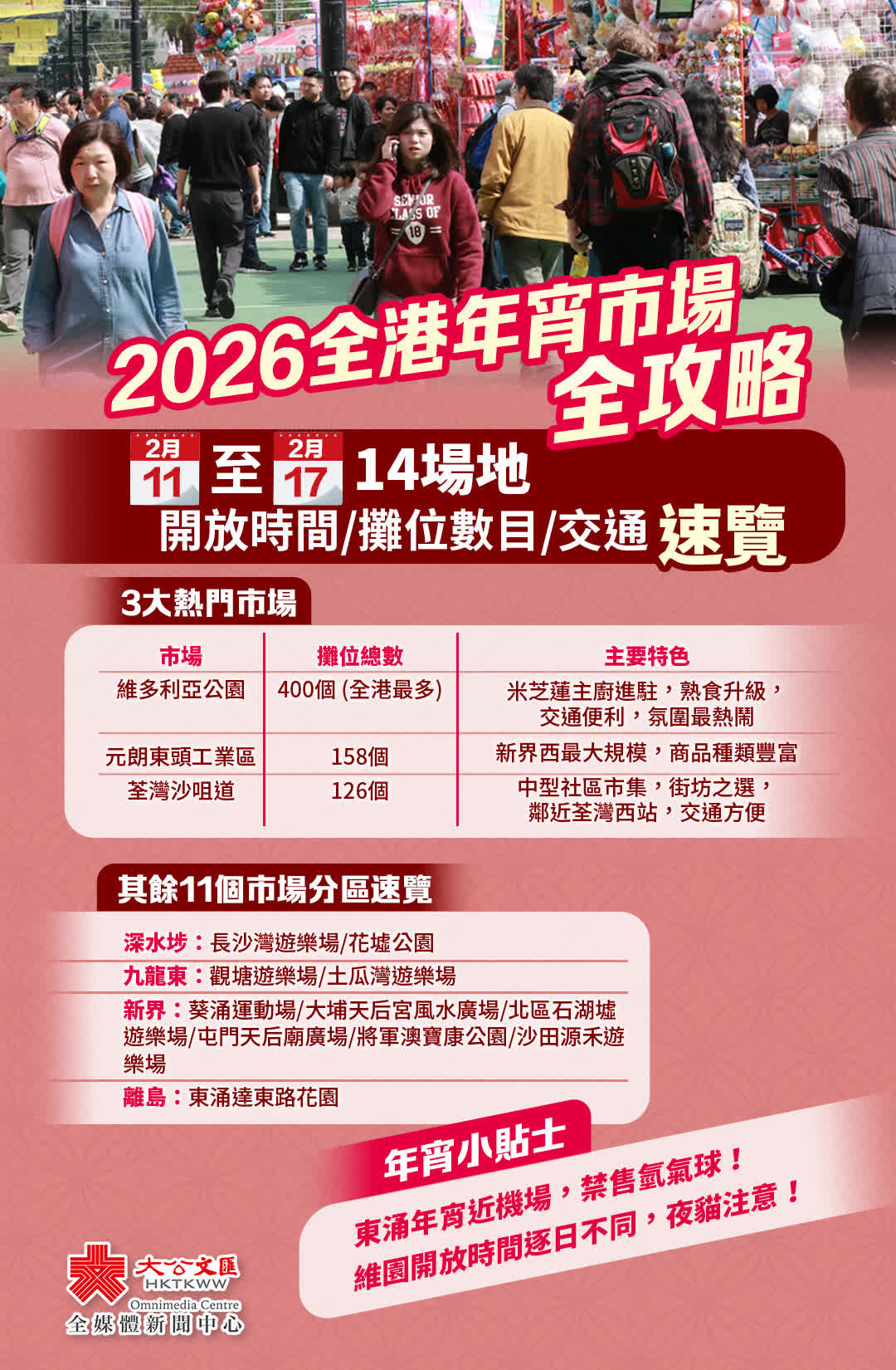 (大公文匯全媒體 記者 馮書朋 整理報道)農曆新年將至,辦年貨的市民請注意!2026年香港年宵市場將於2月11日(年廿四)起,在全港14個公園及遊樂場同步舉行。今年年宵市場規模盛大,涵蓋傳統濕貨、各式乾貨及特色美食。大公文匯全媒體為你整合年宵市場的亮點、攤位分布及詳細交通攻略,出發前必看這篇懶人包!