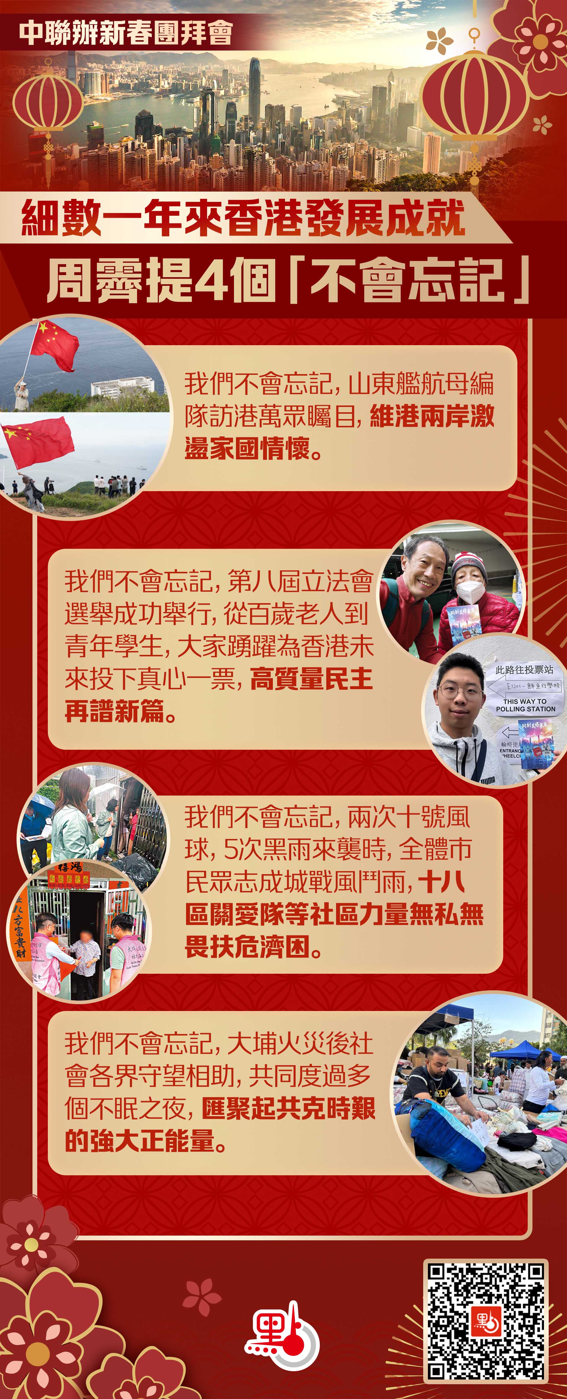 一年來,香港的發展成就,得益於「一國兩制」制度優勢,得益於中央政府和祖國內地大力支持,得益於包括大家在內的特別行政區社會各界人士勠力同心、團結奮鬥。我們不會忘記,山東艦航母編隊訪港萬眾矚目,維港兩岸激盪家國情懷。我們不會忘記,第八屆立法會選舉成功舉行,從百歲老人到青年學生,大家踴躍為香港未來投下真心一票,高質量民主再譜新篇。我們不會忘記,兩次十號風球、5次黑雨來襲時,全體市民眾志成城戰風鬥雨,十八區關愛隊等社區力量無私無畏扶危濟困。我們不會忘記,大埔火災後社會各界守望相助,共同度過多個不眠之夜,匯聚起共克時艱的強大正能量。一幅幅難忘的畫面啟示我們,只要始終弘揚「獅子山精神」,同舟共濟、無畏無懼、踏平崎嶇,香港由治及興的征途上就沒有什麼克服不了的困難,就沒有什麼攀登不了的高峰!