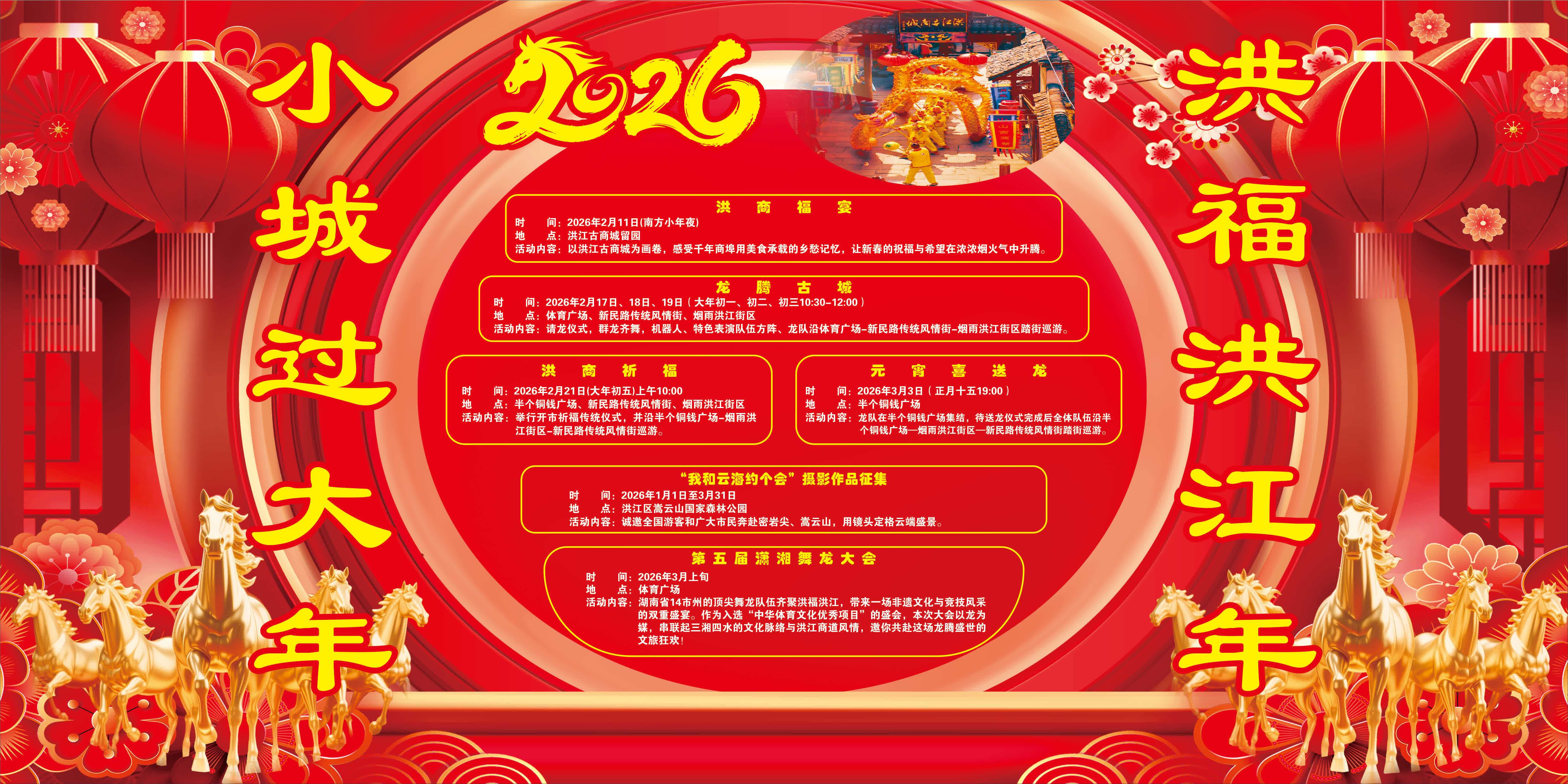 春節前後,濃濃年味瀰漫古城。南方小年夜,洪商福宴將以洪江古商城為背景,尋味舌尖上的鄉愁與溫情;大年初一,「龍騰古城」大巡遊活動,將以傳統請龍儀式結合機器人方陣等現代元素,上演一場民俗與科技相融的盛景;初二、初三,數十條龍獅接連踏街巡遊,與市民遊客共迎新春;大年初五,洪商祈福儀式再現接財神、開市納吉的傳統場景;正月十五,一場傳統的元宵喜送龍活動,將「洪福洪江年、小城過大年」活動推向高潮。