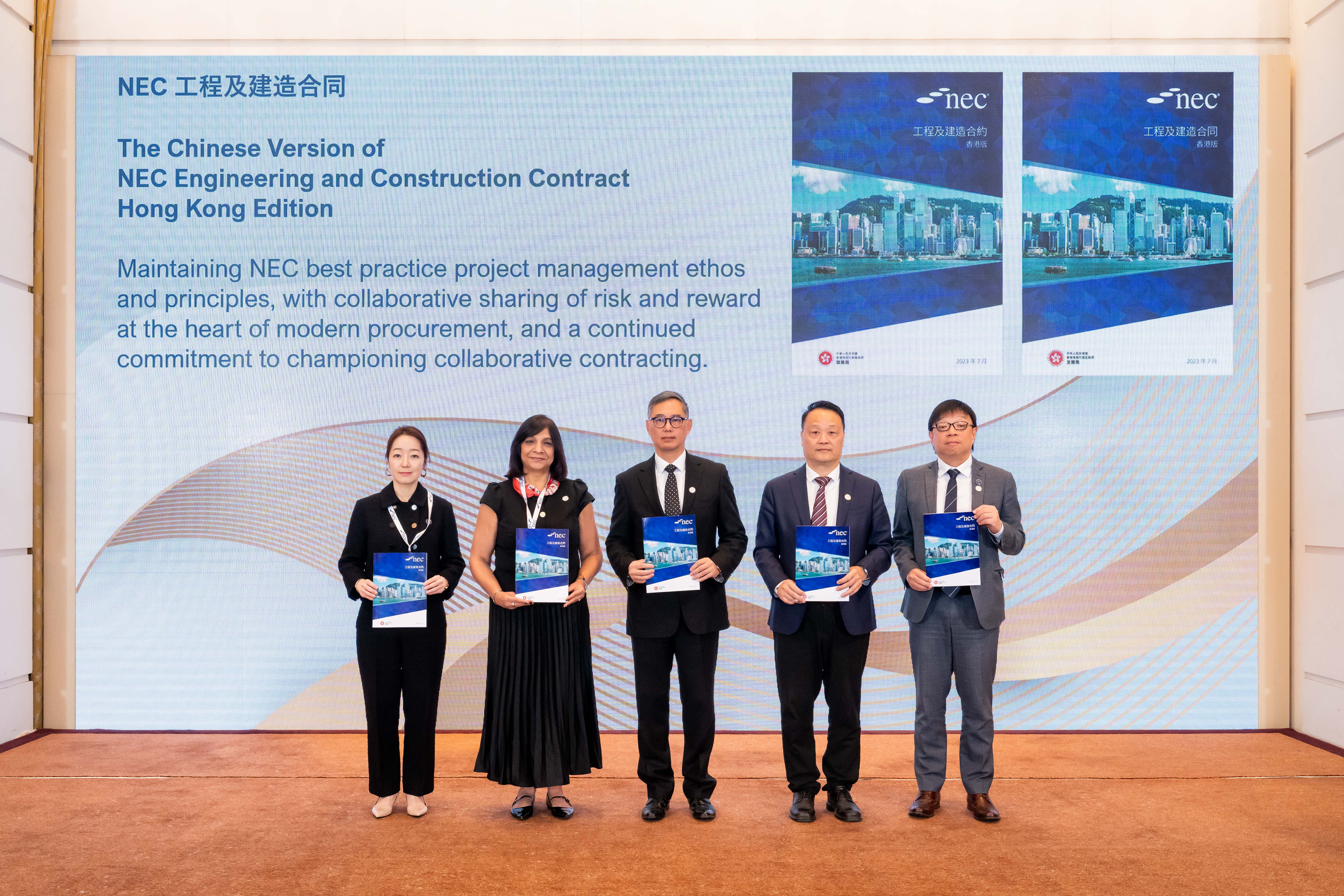 有別於傳統合約,NEC合約在條款引入完整的項目管理系統,包括風險預警機制、合約方之間的補償機制和行動時間表,提倡合約方攜手解決問題,達致雙贏。自2009年引入至今,香港已有超過820項工務工程採用NEC,總值超過5,300億元;其他公營機構包括香港機場管理局和香港鐵路有限公司亦已應用。發展局將繼續提倡 NEC 精神,深化團隊協作,鞏固香港作為國際基建中心的地位。