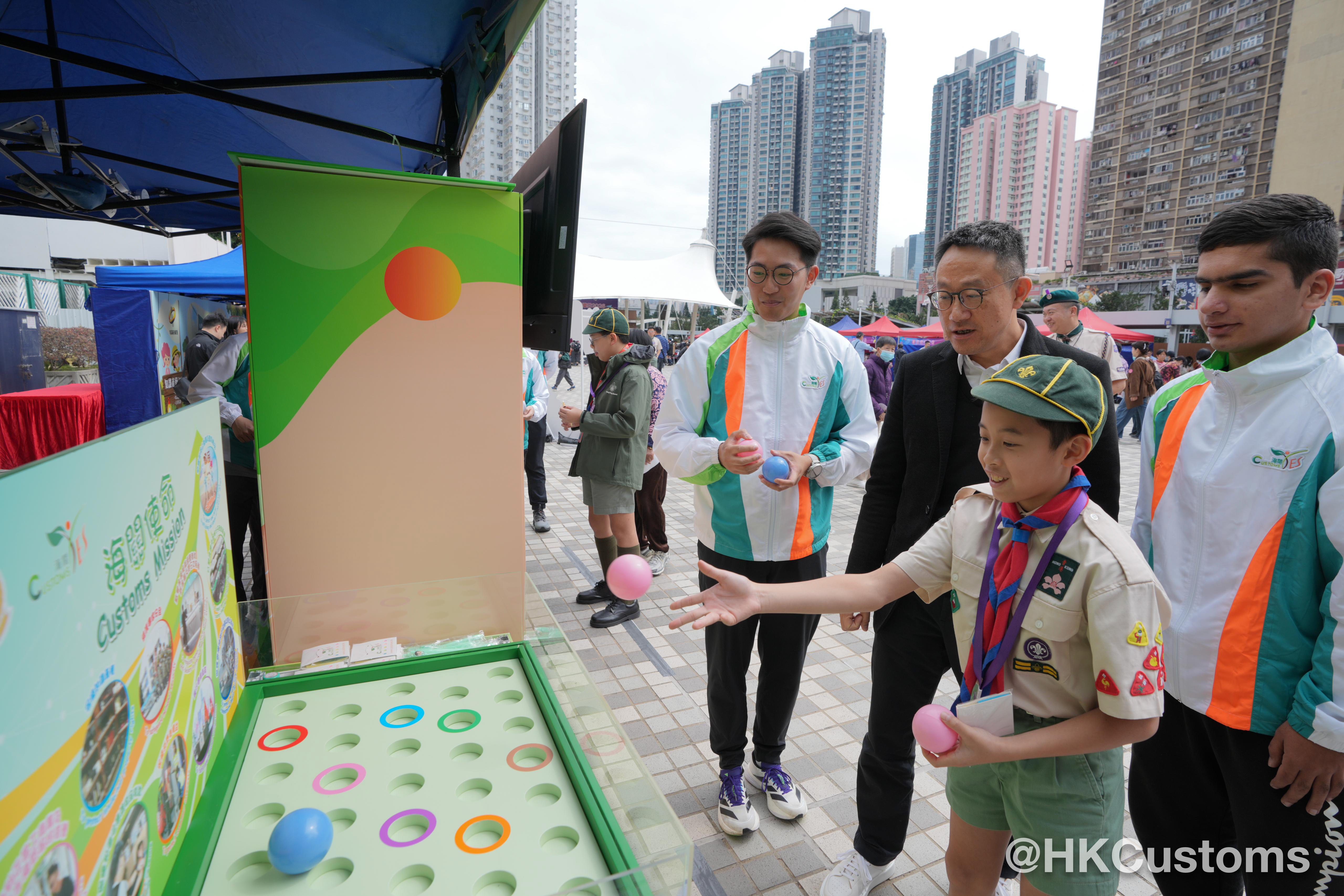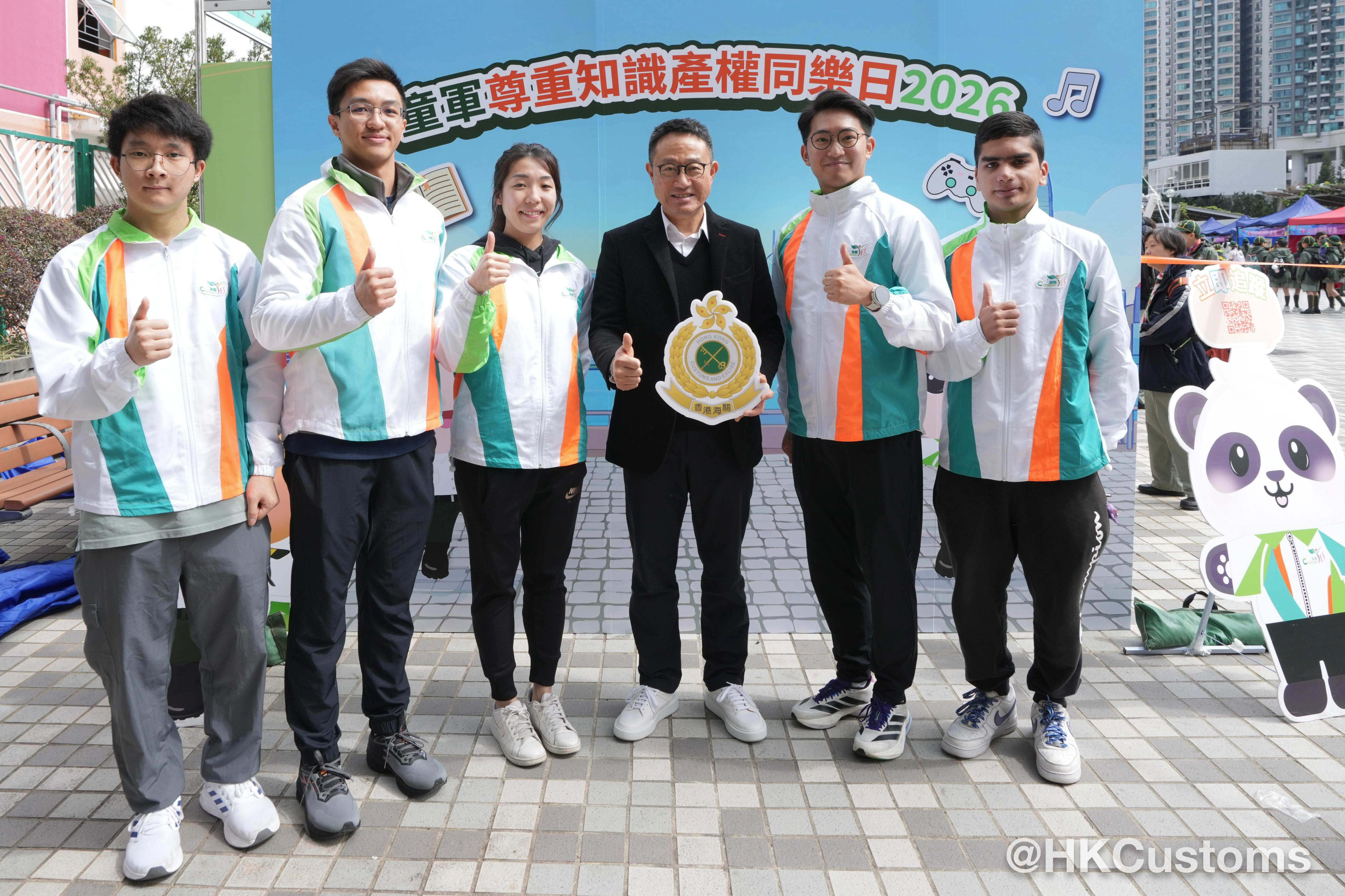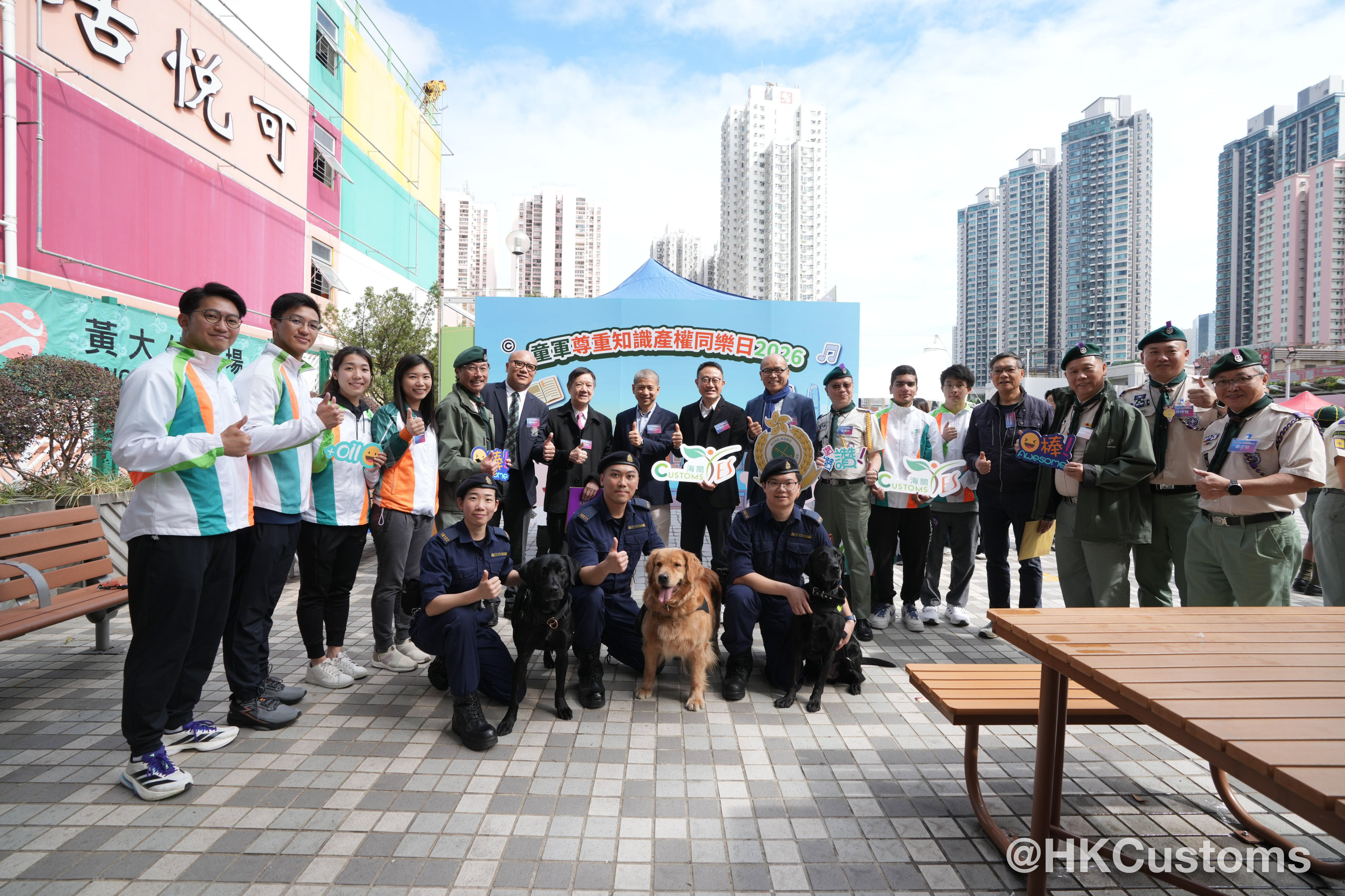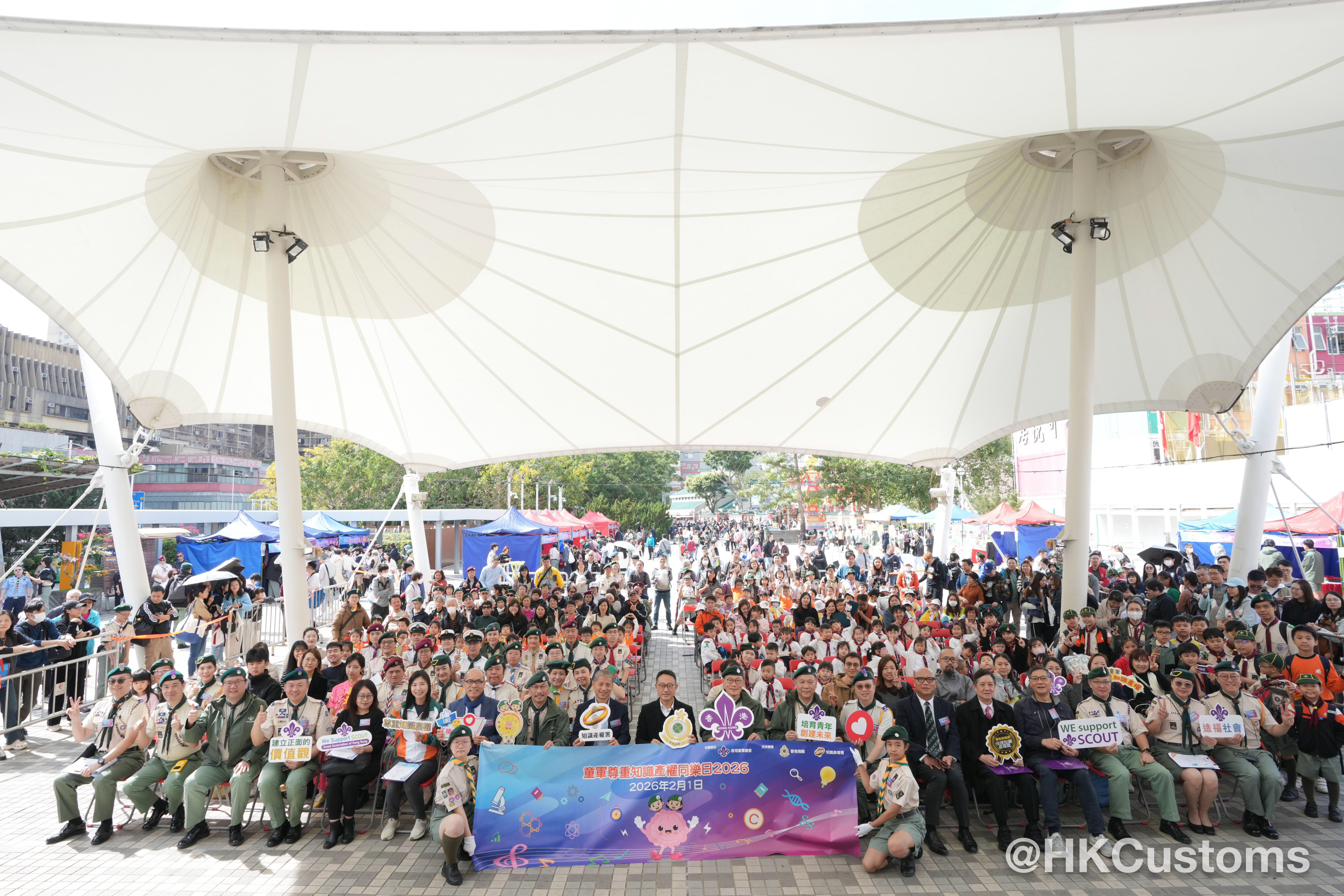 香港海關關長陳子達於黃大仙廣場出席由香港童軍總會主辦、香港海關全力支持嘅「童軍尊重知識產權同樂日 2026」。陳子達聯同知識產權署署長黃福來、香港童軍總會署理總監及多位嘉賓代表,一同為活動主持啟動儀式。