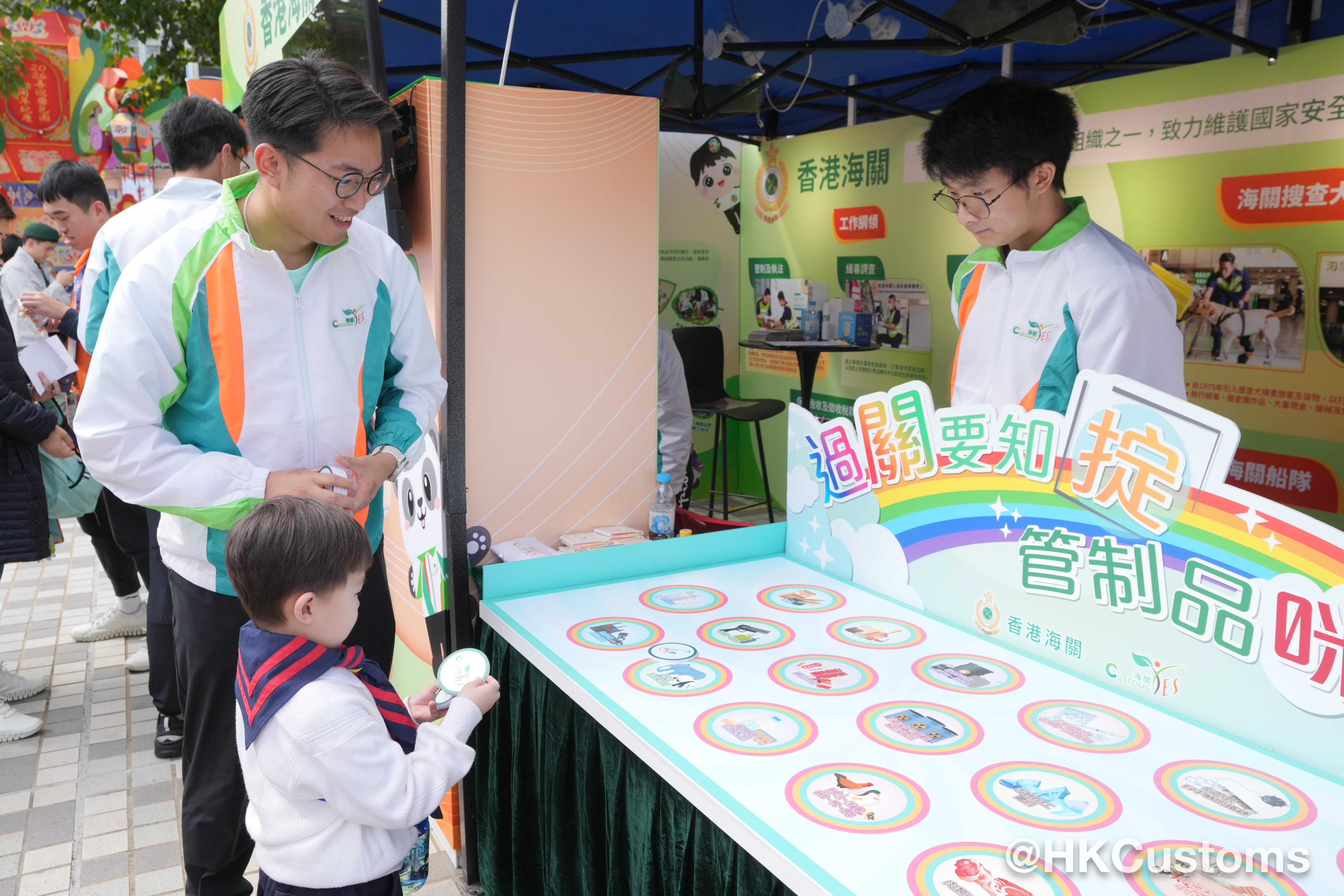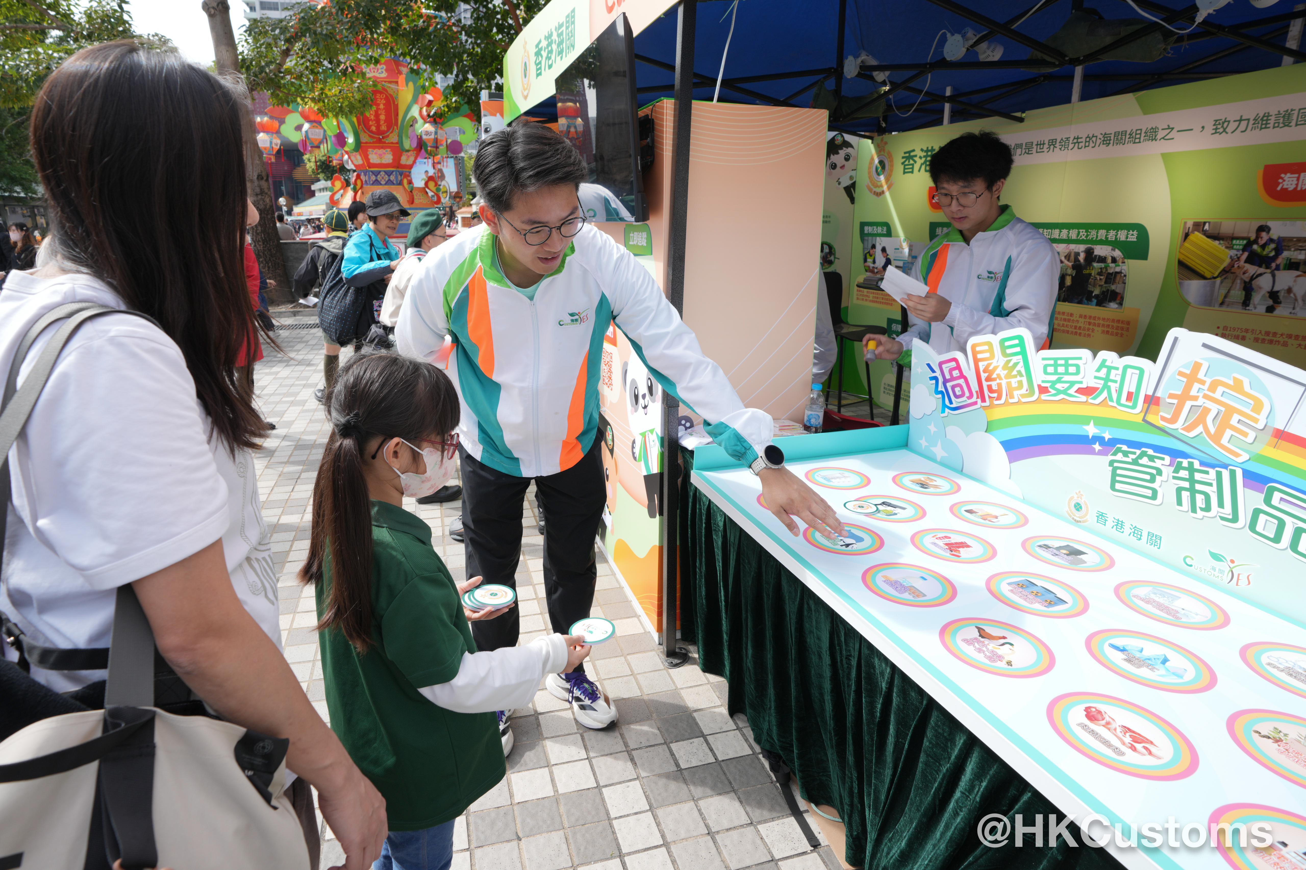 Customs YES 亦於現場設置攤位遊戲,透過吸引又具趣味的互動形式,向市民介紹海關在保護知識產權方面的執法工作,同時推廣 Customs YES 的多元青年發展活動,吸引唔少市民駐足參與,反應熱烈。