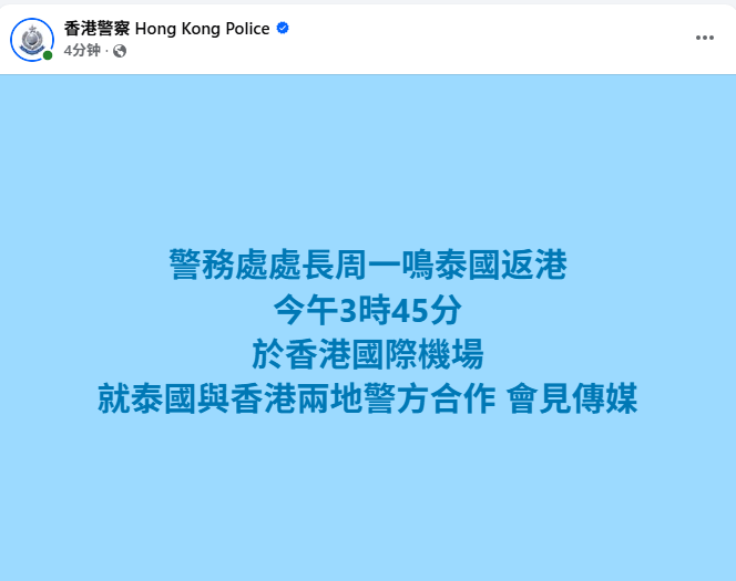 大公文匯全媒體報道,警務處在社交平台發文表示,警務處處長周一鳴今日(5日)從泰國返回香港,將於下午3時45分在香港國際機場會見傳媒,交代泰國與香港兩地警方合作的相關事宜。