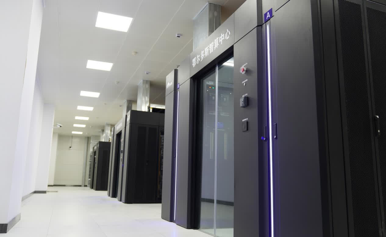而在另一邊的鄂爾多斯萬界智算中心機房裏,一排排服務器機櫃整齊排列,服務器不時閃爍着紅綠色的「智慧」光芒,一陣陣若有若無的寒意將算力產生的無限熱量消解於無形。