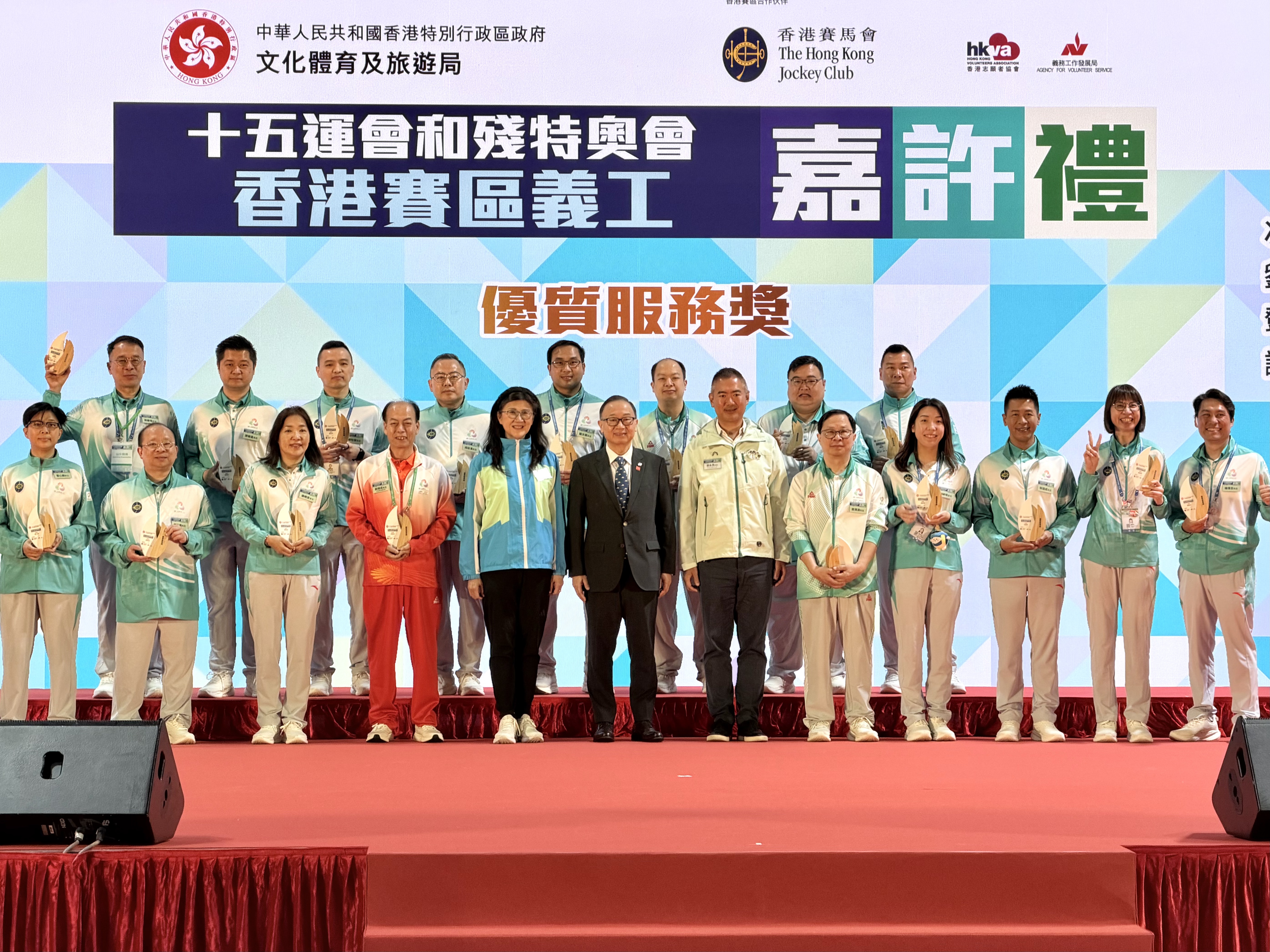 (大公文匯全媒體 記者 梁譯尹)為表揚「第十五屆全國運動會香港賽區義工計劃」15,000名義工在十五運會和殘特奧會香港賽區的卓越貢獻,「十五運會和殘特奧會香港賽區義工嘉許禮」(嘉許禮)今日(7日)下午在香港單車館隆重舉行。政務司司長陳國基、香港賽馬會主席廖長江、文化體育及旅遊局局長羅淑佩等嘉賓出席活動。