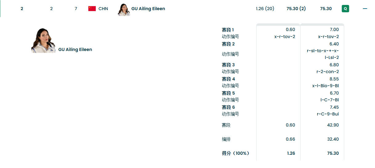 谷愛凌第二滑迅速調整狀態,以流暢動作完成高難度技術組合(包括270接正滑、倒滑900及正滑左轉720),最終獲得75.30分(細分:障礙區42.90分 + 跳台區32.40分),排名躍升至第二位。憑藉第二輪高分,谷愛凌鎖定決賽資格,成為該項目衝金熱門選手之一。