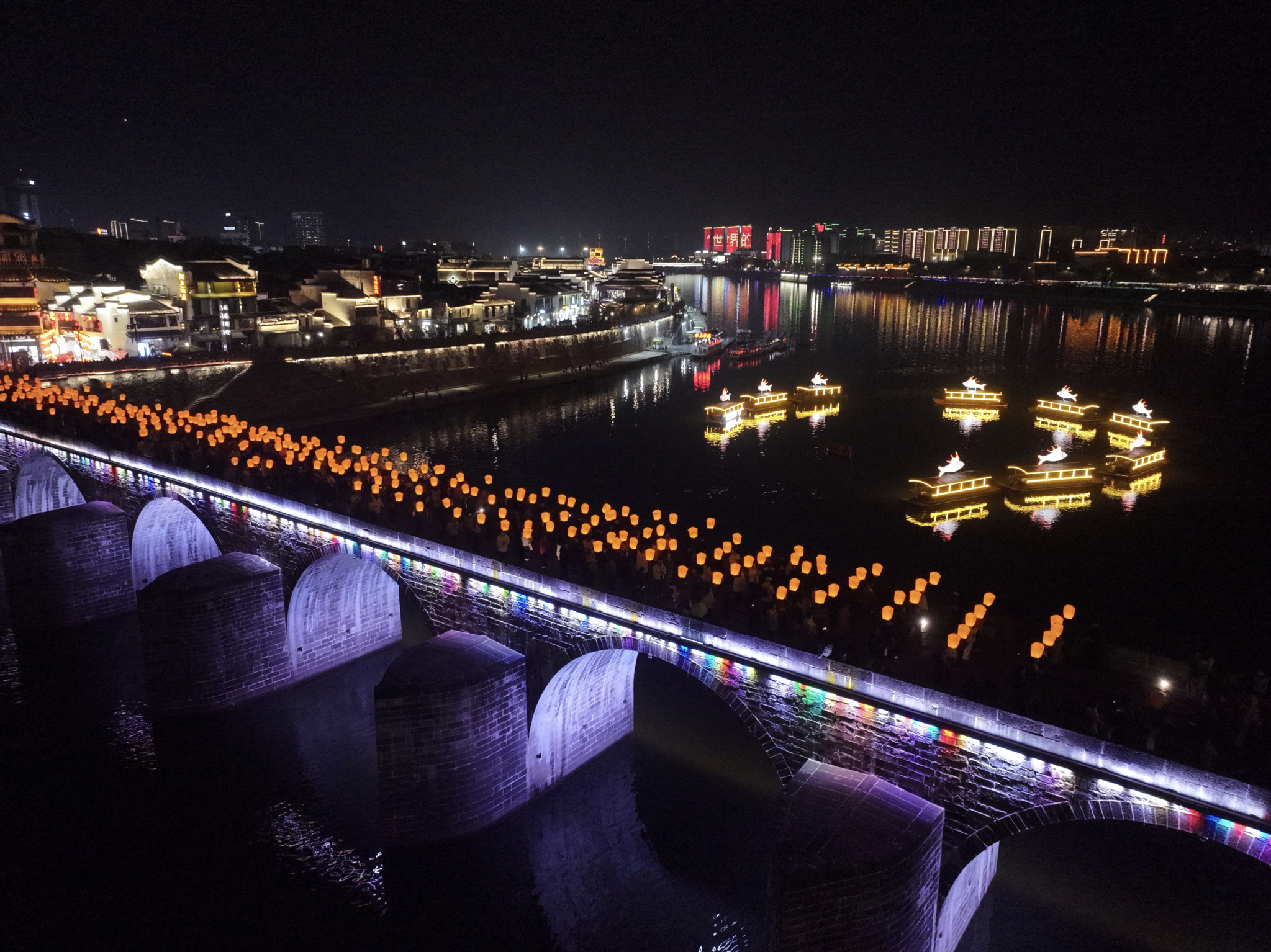 江上,遊船緩緩行駛,載着滿城燈火與人間暖意,勾勒出獨屬於屯溪的詩意與繁華。300多個滿載着人們對馬年新春的濃濃祝福的孔明燈從鎮海橋上緩緩升空,市民和遊客寫下新年心愿,解鎖「雲端寄福」讓新春的喜樂直達心底。