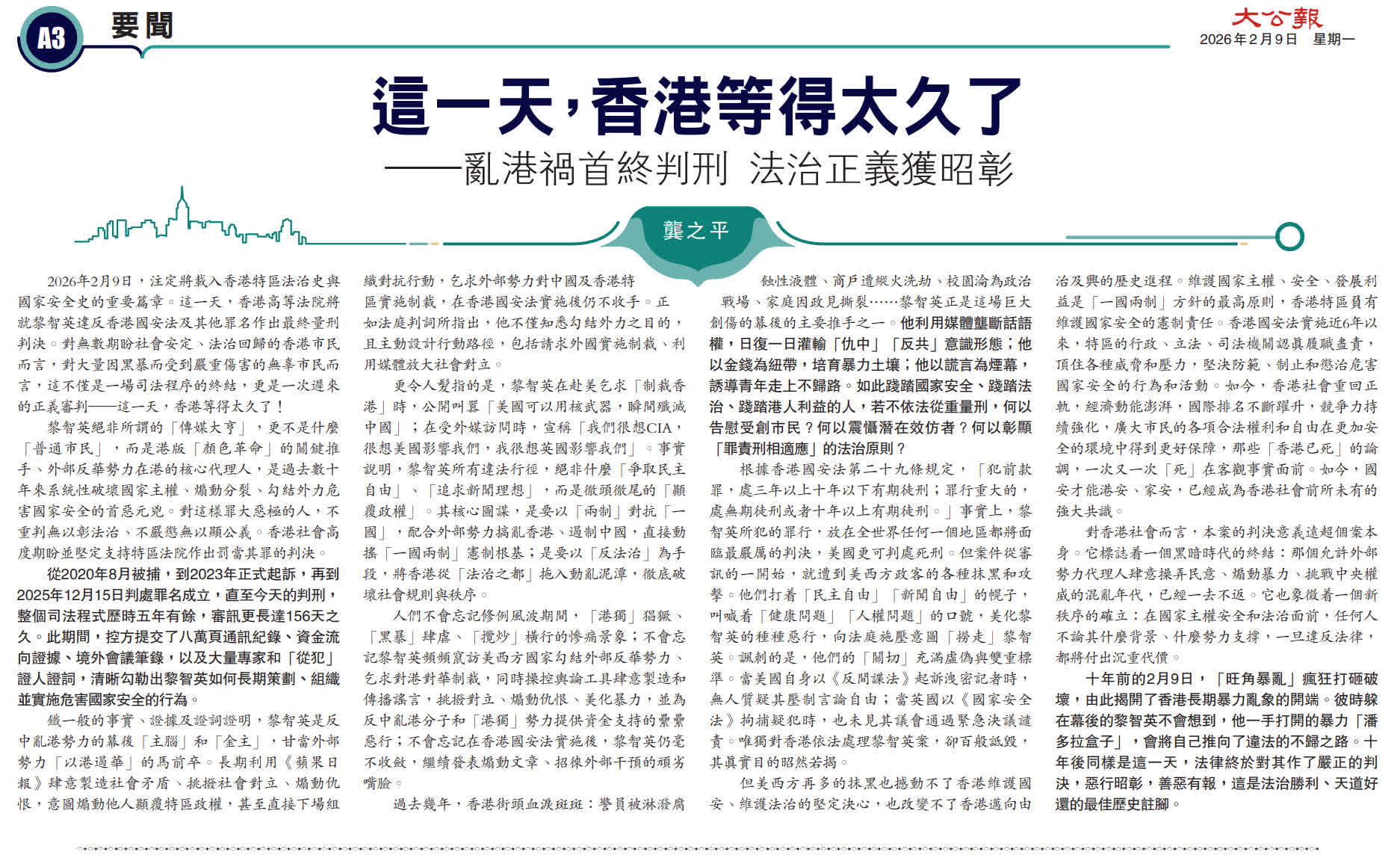 2026年2月9日,注定將載入香港特區法治史與國家安全史的重要篇章。這一天,香港高等法院將就黎智英違反香港國安法及其他罪名作出最終量刑判決。對無數期盼社會安定、法治回歸的香港市民而言,對大量因黑暴而受到嚴重傷害的無辜市民而言,這不僅是一場司法程序的終結,更是一次遲來的正義審判──這一天,香港等得太久了!