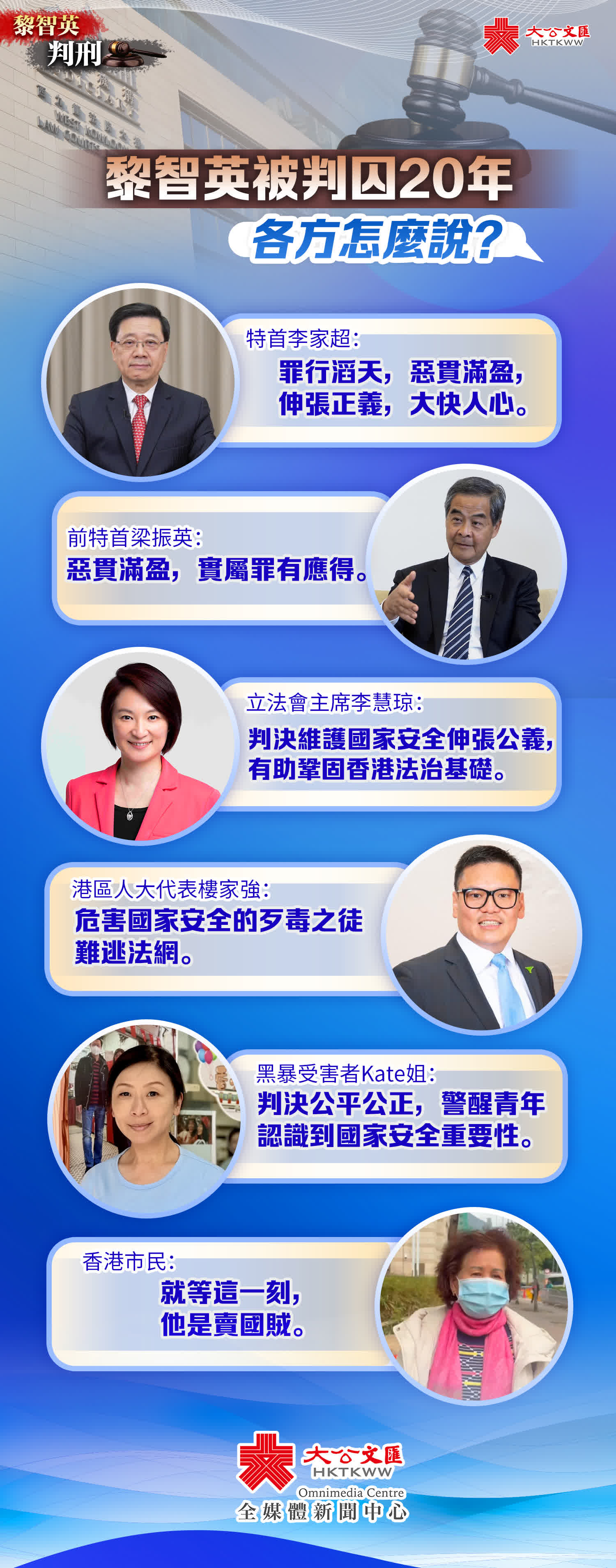 法庭今日判決,黎智英被判囚20年,其中18年須分期執行;李宇軒判囚7年3個月;陳梓華判囚6年3個月;張劍虹判囚6年9個月;陳沛敏判囚7年;馮偉光判囚10年;林文宗判囚10年;楊清奇判囚7年3個月。