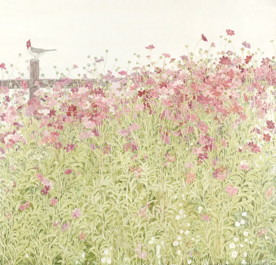 如一幅方構圖的作品《憤怒的小鳥》,畫面中,粉、紅、白交織的花簇層層疊疊,一隻紅頂小鳥出現在左上角。這就是以東方美學詮釋大眾熟悉的流行IP的一次探索,在鮑鶯筆下,小鳥的「憤怒」其實是自然生命活潑潑的張力。