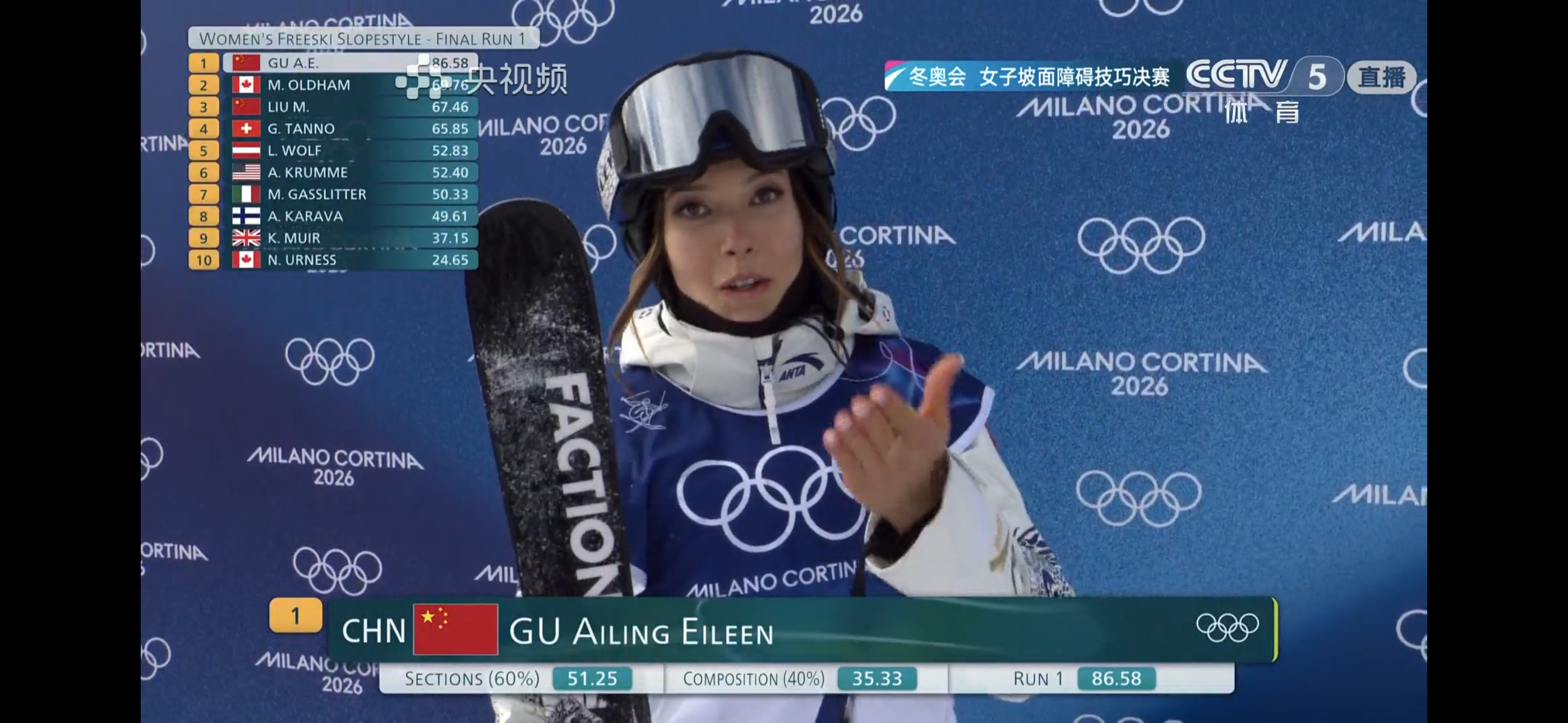 米蘭冬奧會|全程絲滑 谷愛凌決賽首輪得分86.58分暫列第一